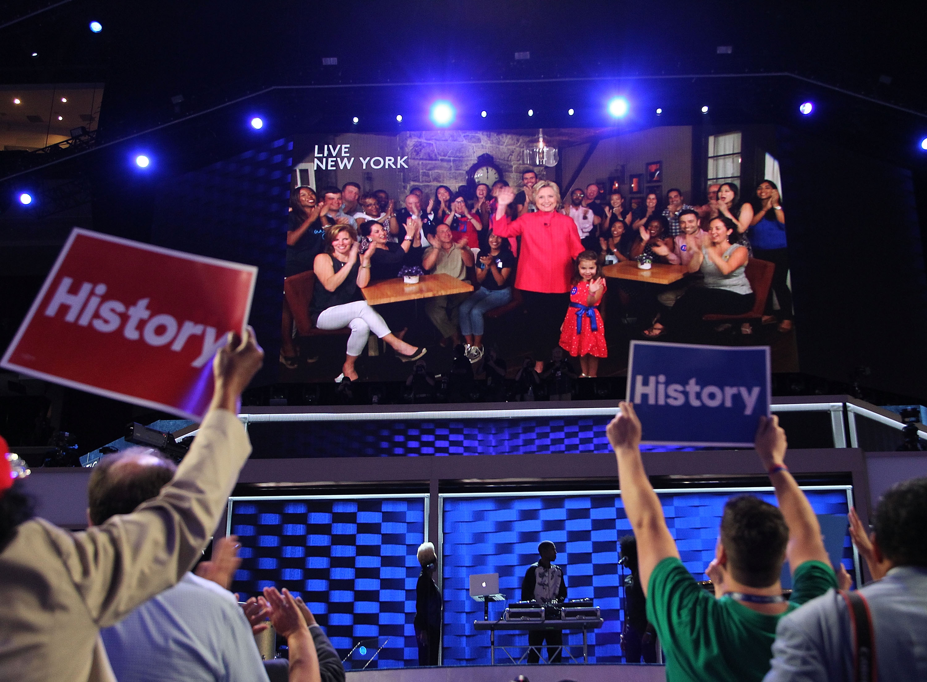 PHILADELPHIA, PA – JULY 26: Democratic presidential nominee Hillary Clinton delivers remarks via a video screen on the second day of the 2016 Democratic National Convention at Wells Fargo Center on July 26, 2016 in Philadelphia, Pennsylvania. An estimated 50,000 people are expected in Philadelphia, including hundreds of protesters and members of the media. The four-day Democratic National Convention kicked off July 25. (Photo by Paul Morigi/WireImage)