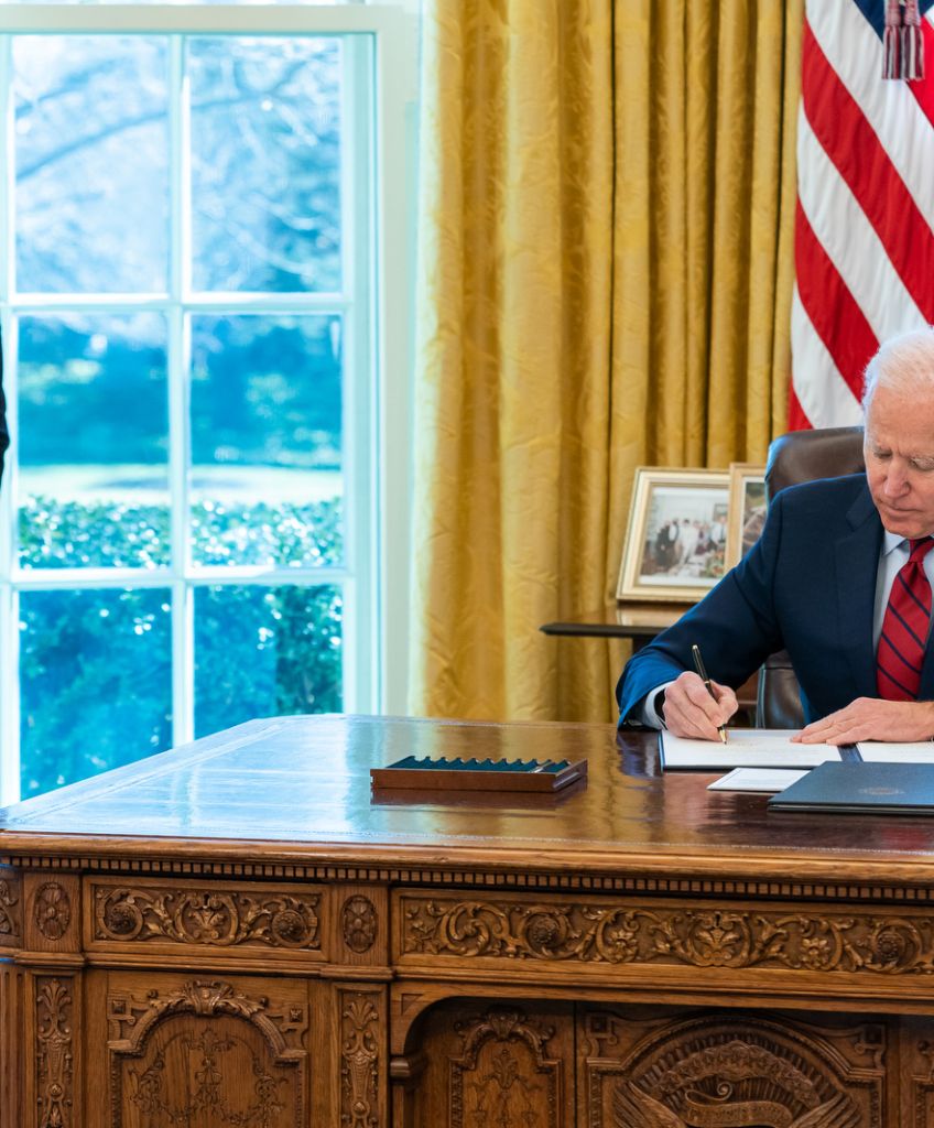 President Joe Biden, joined by Vice President Kamala Harris, signs two executive orders on healthcare Thursday, Jan. 28, 2021, in the Oval Office of the White House. (Official White House Photo by Adam Schultz)
