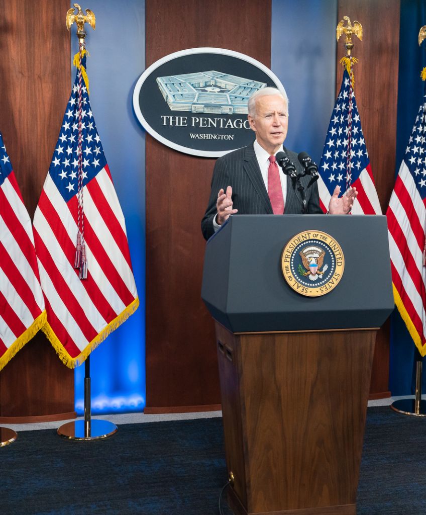 President Joe Biden, joined by Vice President Kamala Harris and Secretary of Defense Lloyd Austin, delivers remarks during a press conference Wednesday, Feb. 10, 2021, at the Pentagon in Arlington, Virginia. (Official White House Photo by Adam Schultz)