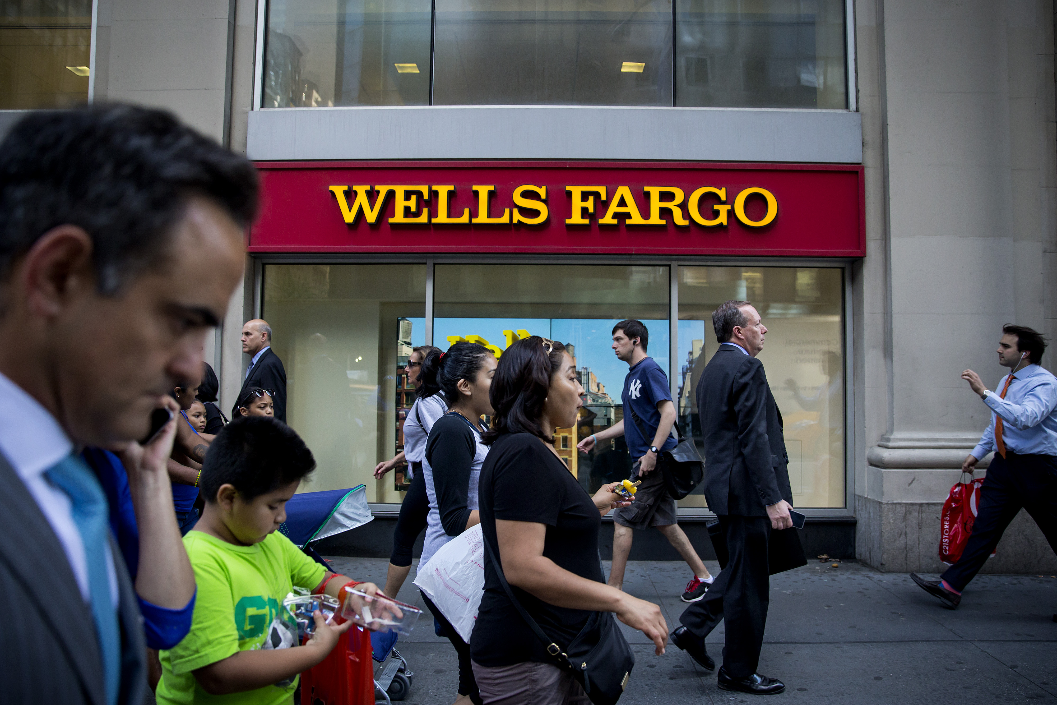 Pedestrians pass in front of a Wells Fargo & Co. bank branch in New York, U.S., on Tuesday, July 12, 2016. Wells Fargo & Co. is scheduled to release earnings figures on July 15. Photographer: Eric Thayer/Bloomberg via Getty Images