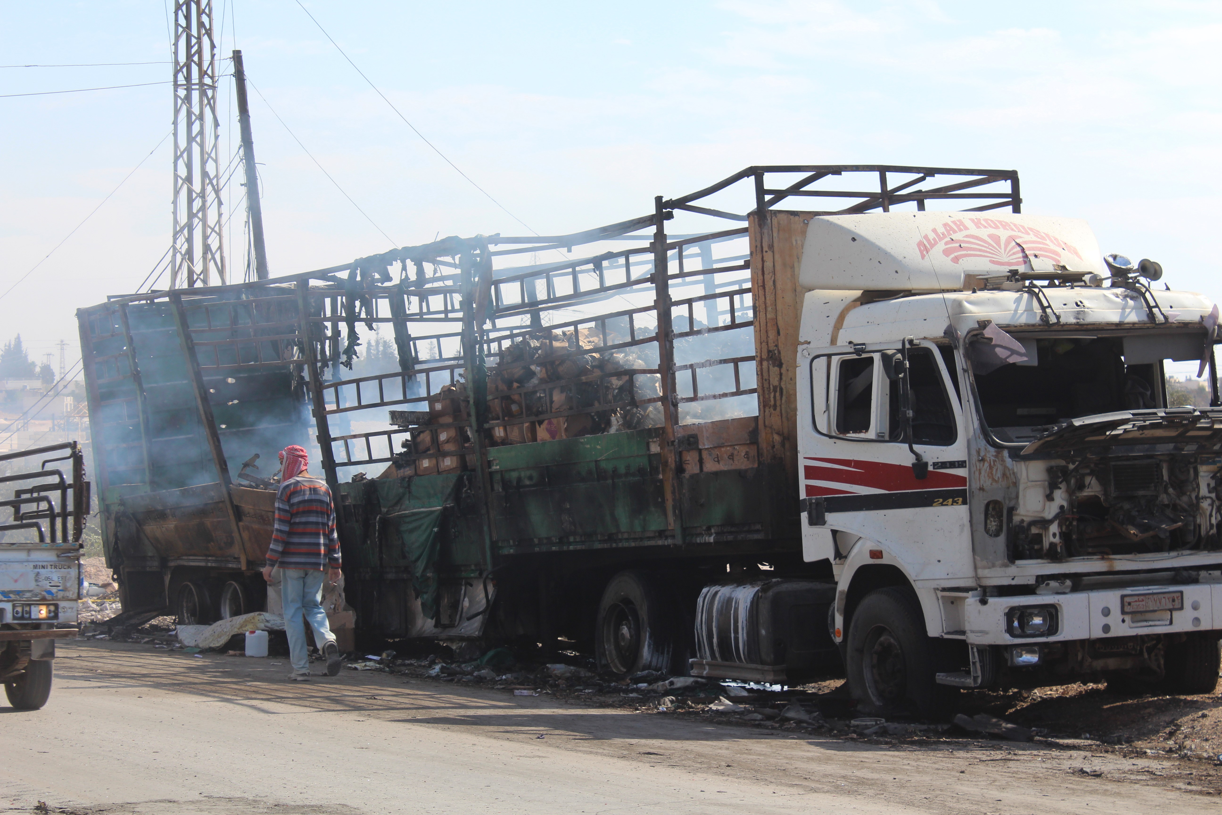 Wreckage of Syrian Red Crescent aid trucks are seen after aid trucks were hit by airstrikes at Urum al-Kubra region in Aleppo, Syria, on September 20. (Photo by Ahmad Hasan/Anadolu Agency/Getty Images)