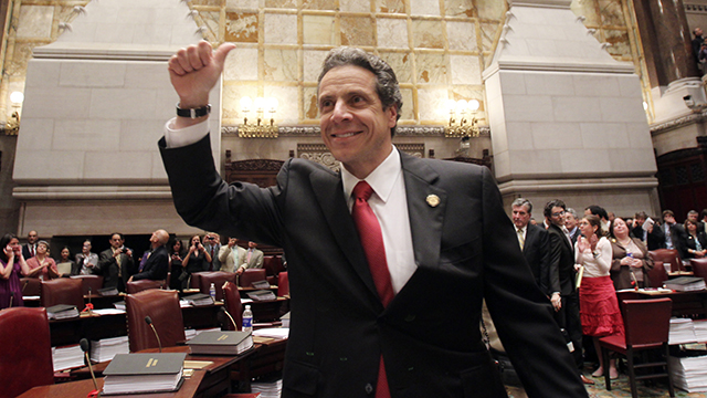 Andrew Cuomo Published January 2, 2015 at 640 × 360 in Andrew Cuomo New York Gov. Andrew Cuomo reacts after same sex marriage was legalized after a vote in the Senate Chamber at the Capitol in Albany, N.Y., on Friday, June 24, 2011. (AP Photo/Mike Groll)