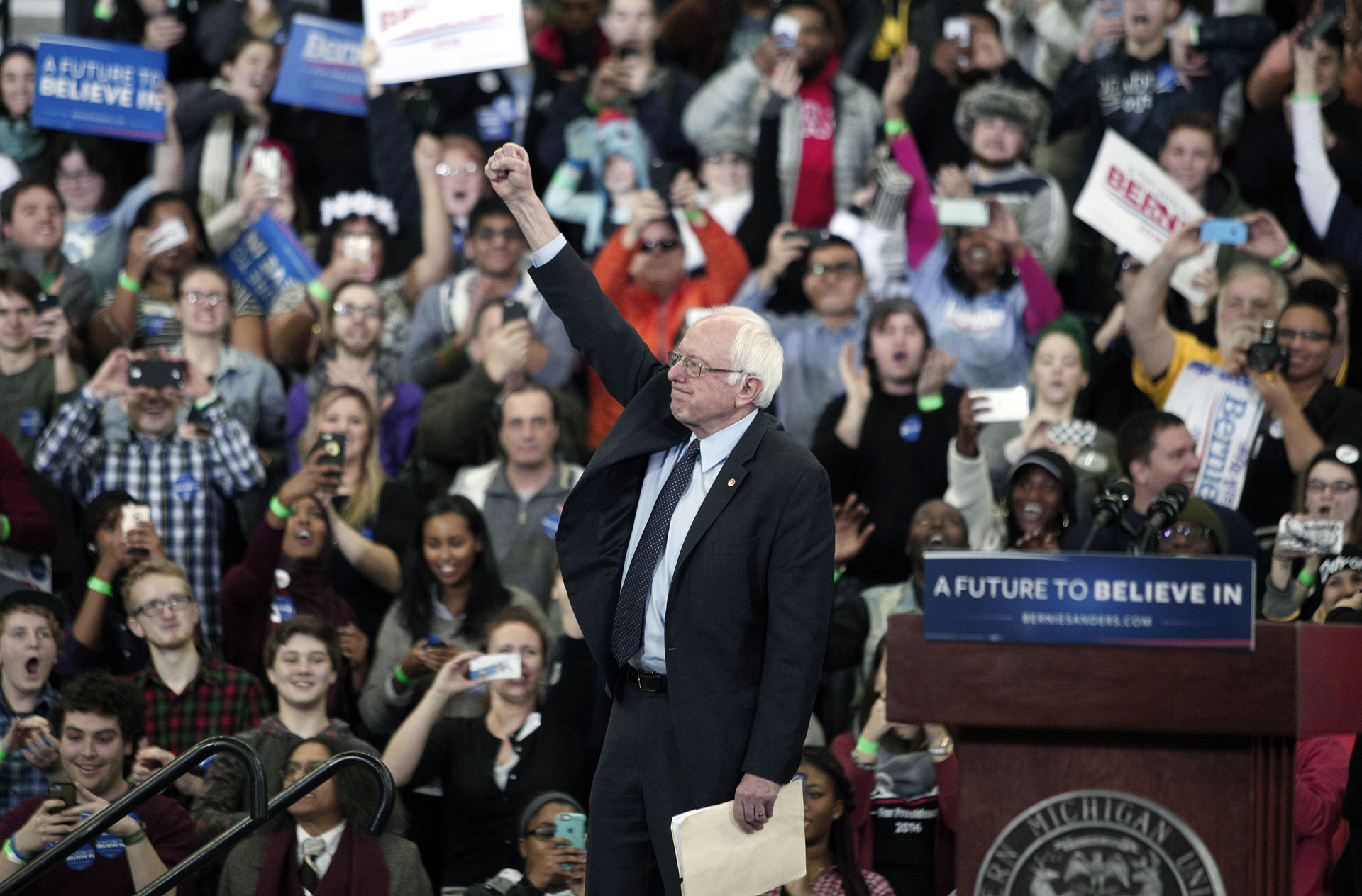 YPSILANTI, MI – FEBRUARY 15: Democratic presidential candidate Sen. Bernie Sanders (D-VT) gestures during his first campaign rally in Michigan at Eastern Michigan University February 15, 2016 in Ypsilanti, Michigan. At his “A Future To Believe In” rally, Sanders spoke on a wide range of issues, including his plans to make public colleges and universities tuition-free. The next voting for the democratic candidates will be the Democratic caucus in Nevada on February 20th. (Photo by Bill Pugliano/Getty Images)