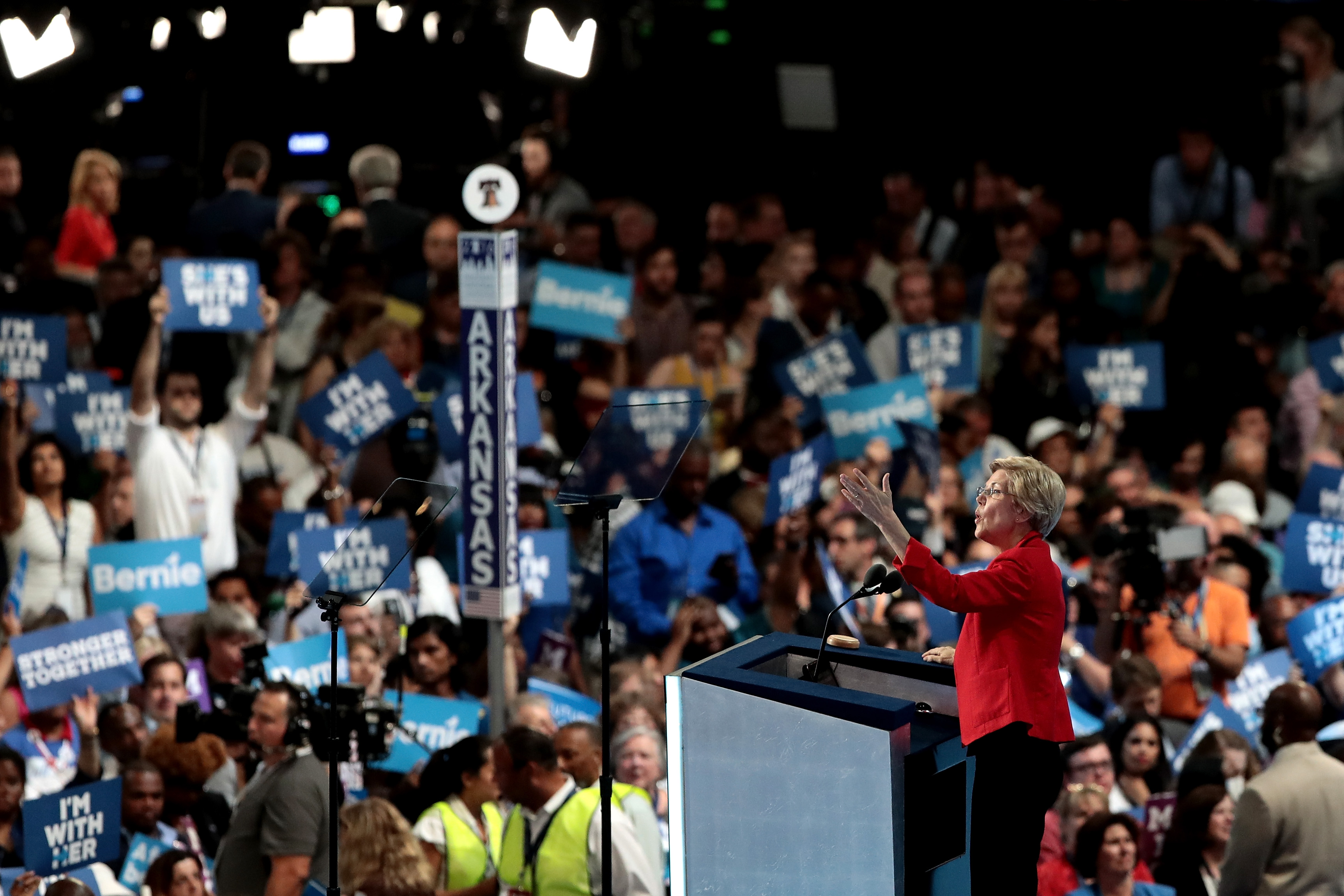 PHILADELPHIA, PA – JULY 25: Sen. Elizabeth Warren (D-MA) delivers remarks on the first day of the Democratic National Convention at the Wells Fargo Center, July 25, 2016 in Philadelphia, Pennsylvania. An estimated 50,000 people are expected in Philadelphia, including hundreds of protesters and members of the media. The four-day Democratic National Convention kicked off July 25. (Photo by Drew Angerer/Getty Images)