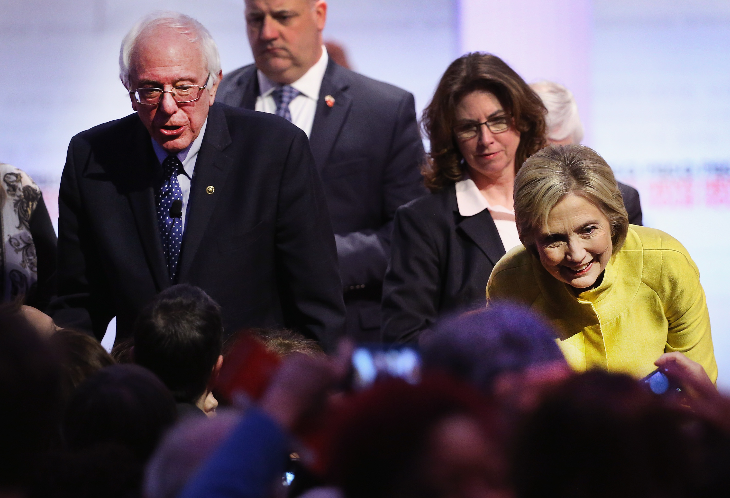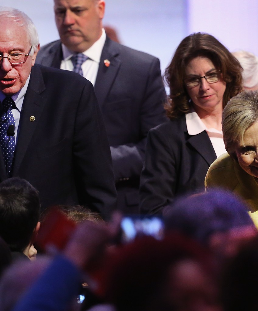 MILWAUKEE, WI – FEBRUARY 11: Democratic presidential candidates Senator Bernie Sanders (L) and Hillary Clinton (R) greet guests after participating in the PBS NewsHour Democratic presidential candidate debate at the University of Wisconsin-Milwaukee on February 11, 2016 in Milwaukee, Wisconsin.The debate is the final debate before the Nevada caucuses scheduled for February 20. (Photo by Win McNamee/Getty Images)