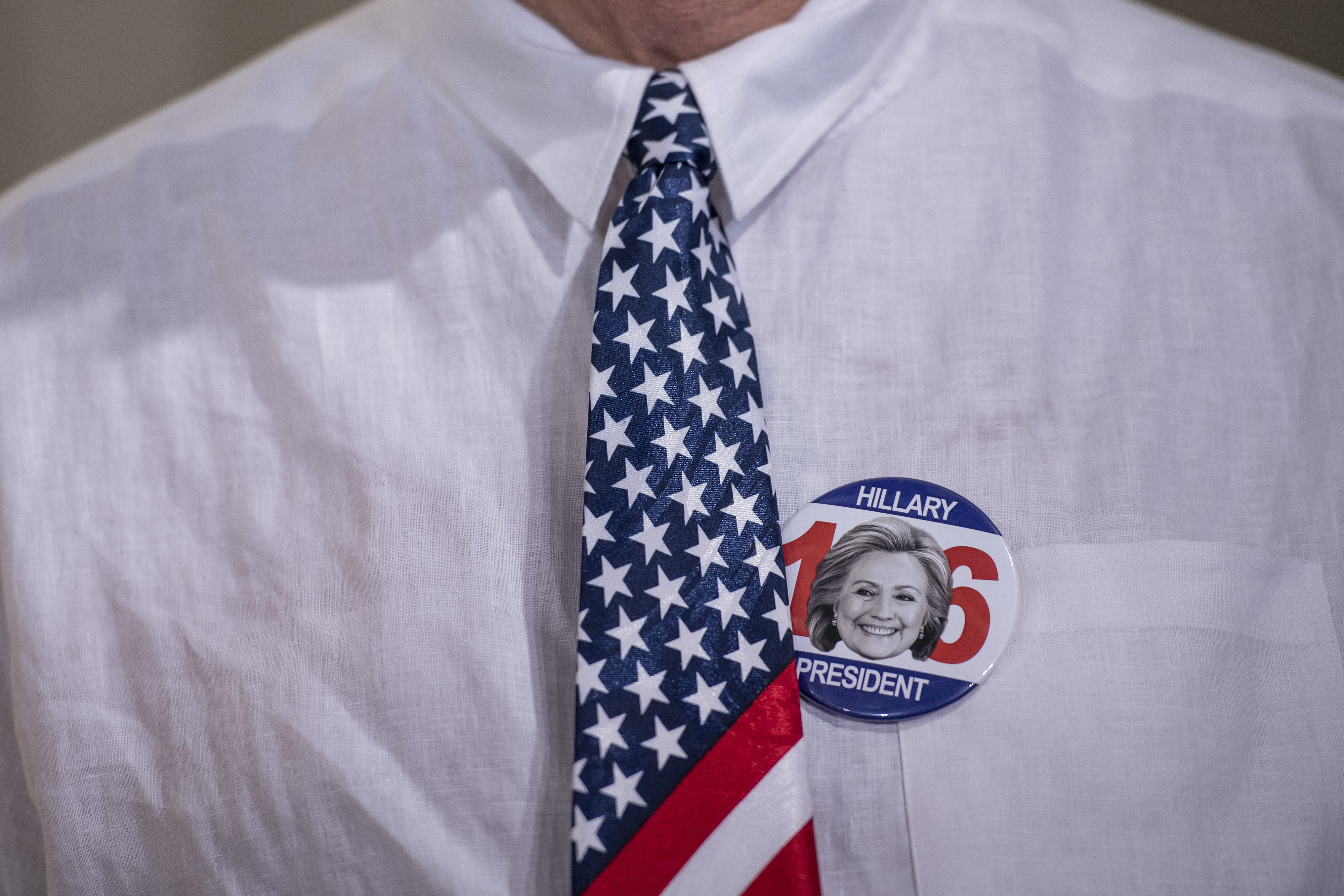 A attendee wears an American flag themed tie and a campaign button for Hillary Clinton, 2016 Democratic presidential nominee, during a campaign event in Las Vegas, Nevada, U.S., on Thursday, Aug. 4, 2016. A Clinton campaign operation to target prominent Republicans who may be primed to defect and support the Democratic presidential nominee is accelerating in the wake of Trump’s repeated missteps and continued intra-party feuding. Photographer: David Paul Morris/Bloomberg via Getty Images