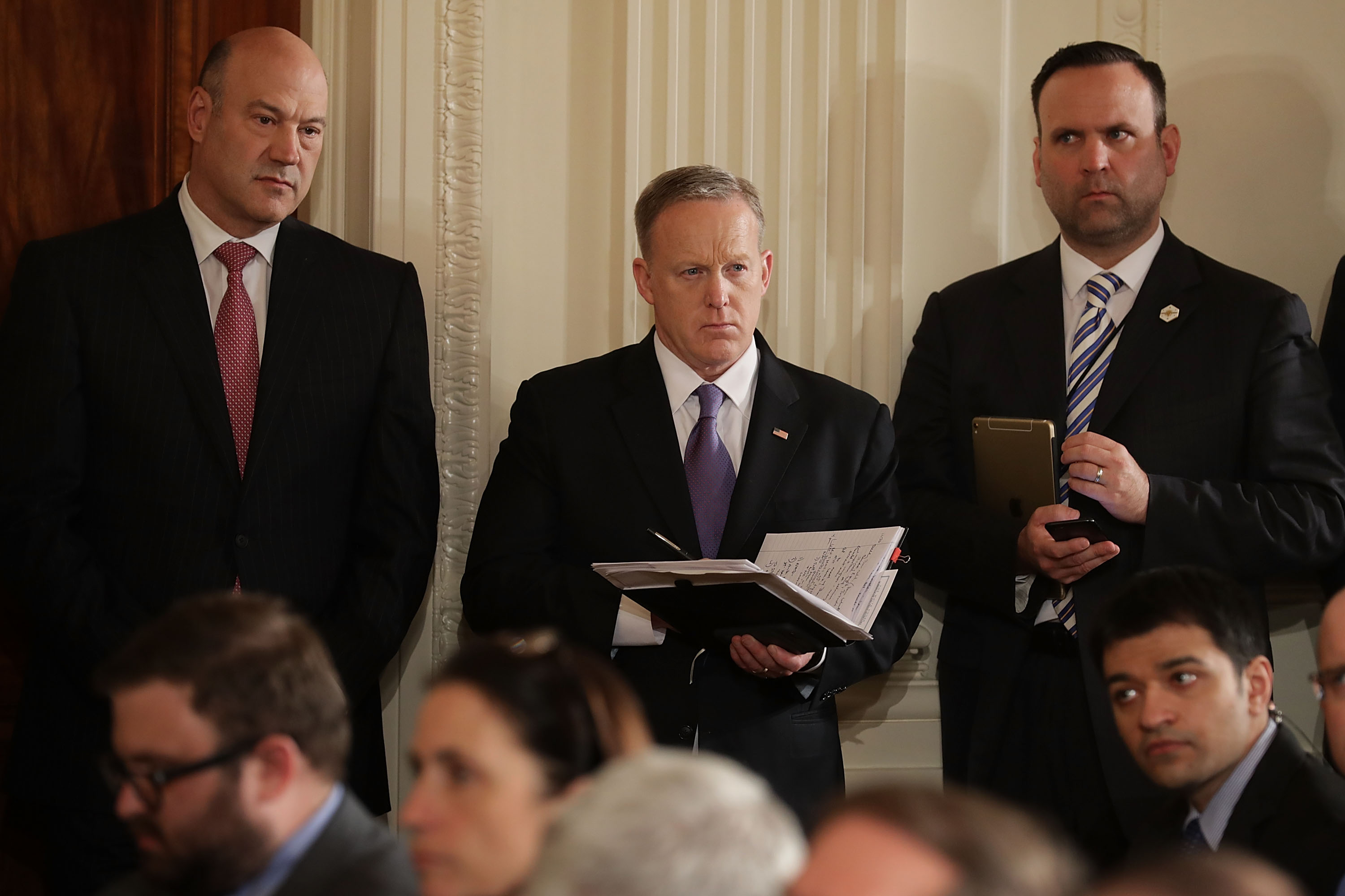 Director of the National Economic Council Gary Cohn (L) and White House Press Secretary Sean Spicer (C) attend a news conference with NATO Secretary General Jens Stoltenberg on April 12, 2017. (Photo by Chip Somodevilla/Getty Images)
