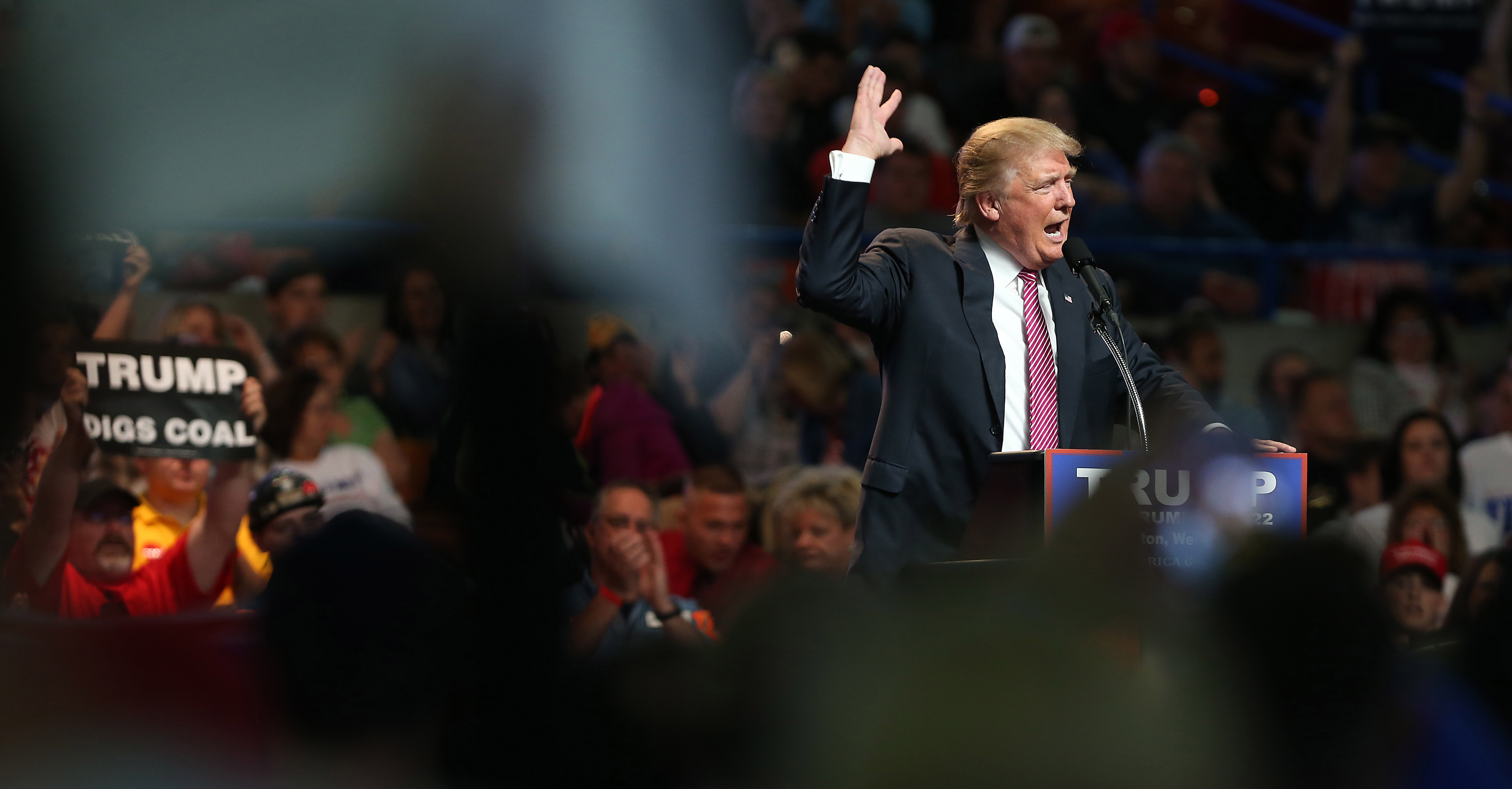 CHARLESTON, WV – MAY 05: Republican Presidential candidate Donald Trump speaks during his rally at the Charleston Civic Center on May 5, 2016 in Charleston, West Virginia. Trump became the Republican presumptive nominee following his landslide win in indiana on Tuesday.(Photo by Mark Lyons/Getty Images)