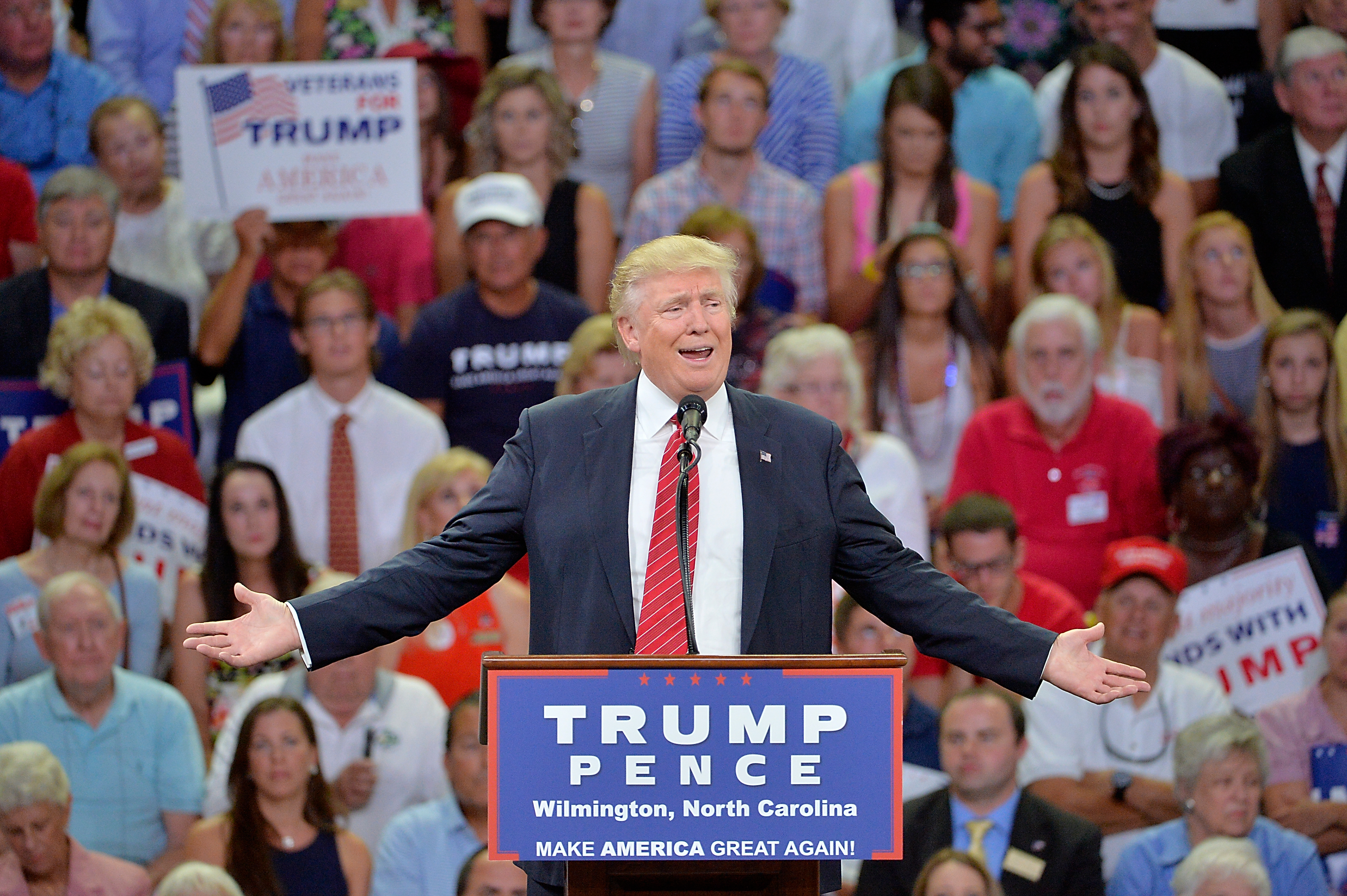 WILMINGTON, NC – AUGUST 9: Republican presidential candidate Donald Trump addresses the audience during a campaign event at Trask Coliseum on August 9, 2016 in Wilmington, North Carolina. This was TrumpĂ•s first visit to Southeastern North Carolina since he entered the presidential race. (Photo by Sara D. Davis/Getty Images)