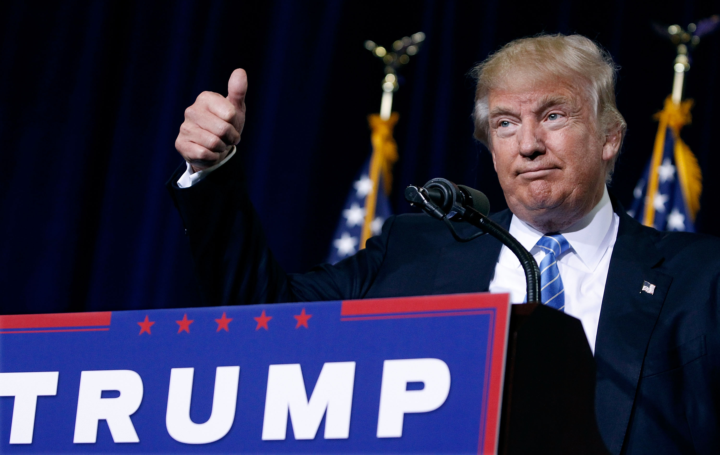 PHOENIX, AZ – AUGUST 31: Republican presidential nominee Donald Trump gives a thumbs up to the crowd during a campaign rally on August 31, 2016 in Phoenix, Arizona. Trump detailed a multi-point immigration policy during his speech. (Photo by Ralph Freso/Getty Images)
