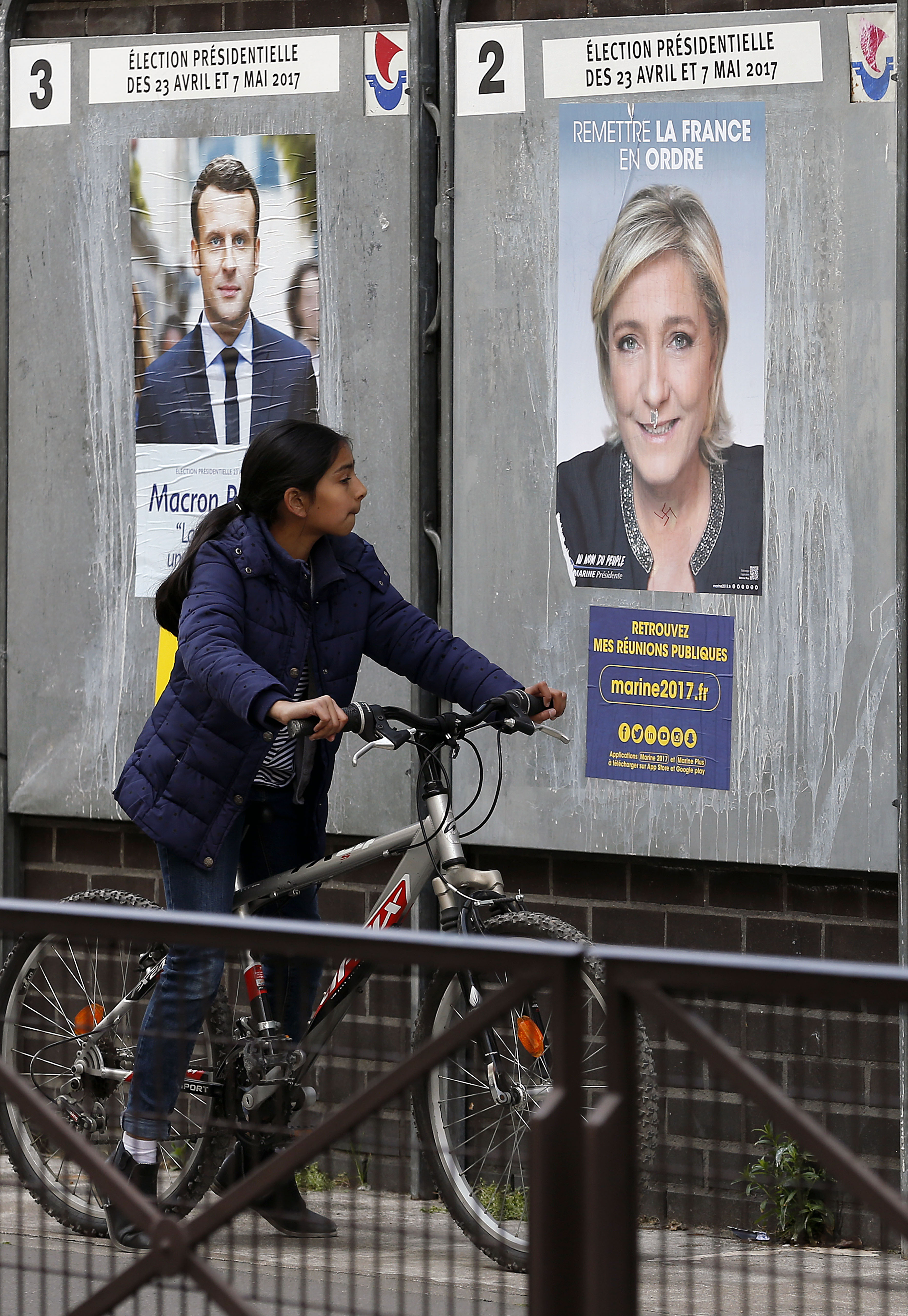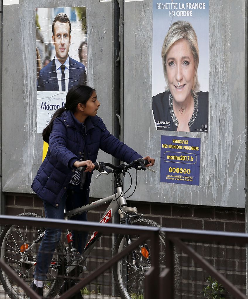 PARIS, FRANCE – APRIL 11: A cyclist looks at an official campaign poster of Marine Le Pen, French National Front (FN) and political party leader and an official poster of Emmanuel Macron, head of the political movement En Marche! (On move ), two of the eleven candidates running in the 2017 French presidential election on April 11, 2017 in Paris, France. The French 2017 presidential election will take place on April 23 and May 07, 2017. (Photo by Chesnot/Getty Images)