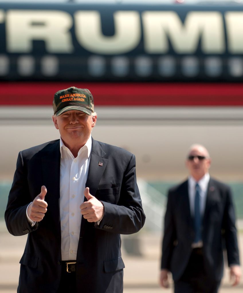 GOP Presidential Candidate Donald Trump Campaigns In Western Pennsylvania Published June 16, 2016 at 4200 × 2590 in GOP Presidential Candidate Donald Trump Campaigns In Western Pennsylvania MOON TOWNSHIP, PA – JUNE 11: Republican candidate for President Donald Trump arrives in his plane to speak to supporters at a rally at Atlantic Aviation on June 11, 2016 in Moon Township, Pennsylvania. (Photo by Jeff Swensen/Getty Images)