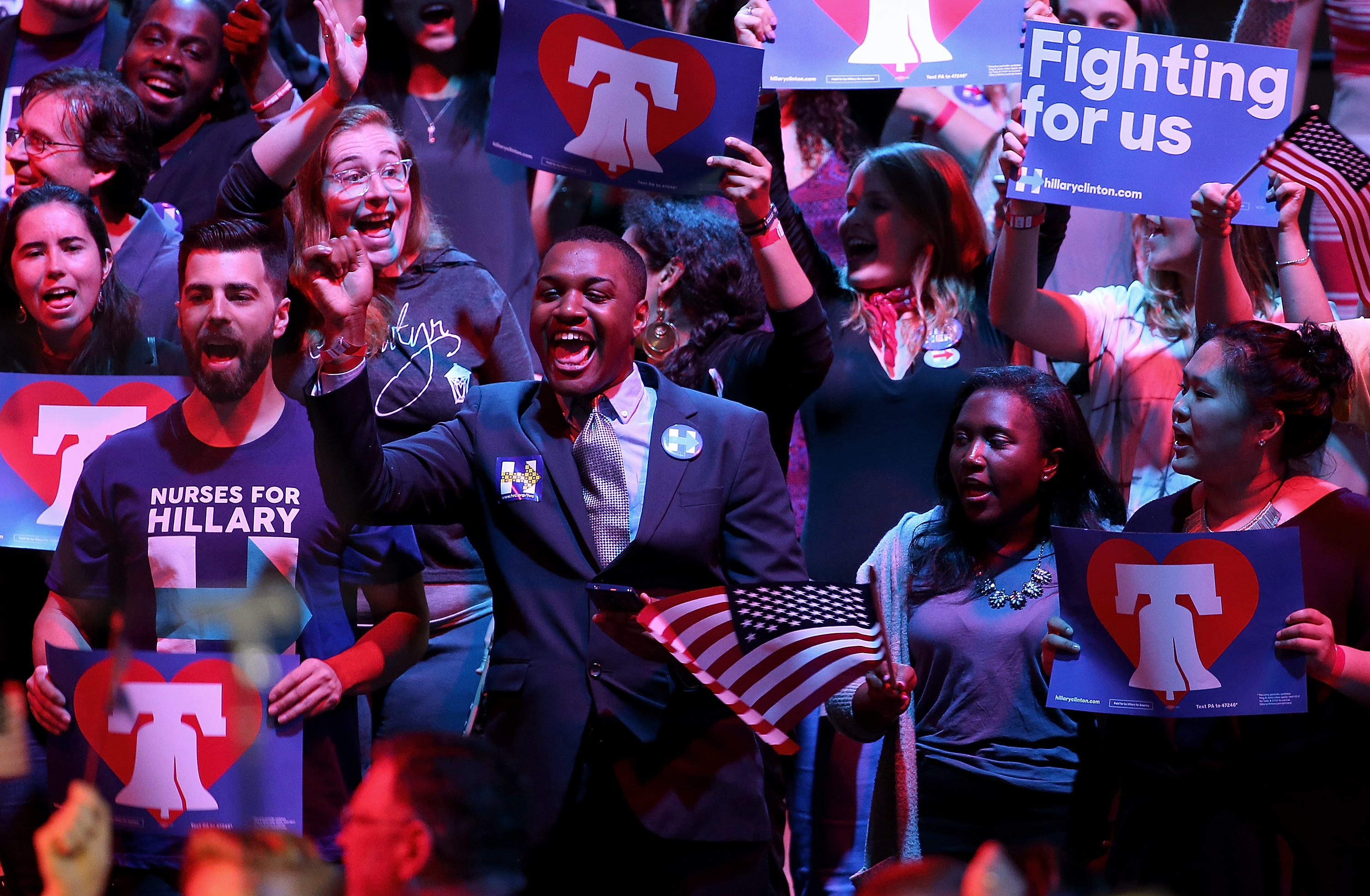 Supporters of Democratic presidential candidate Hillary Clinton react to early projections at a primary night campaign event April 26, 2016 in Philadelphia, Pennsylvania. (Photo by Win McNamee/Getty Images)