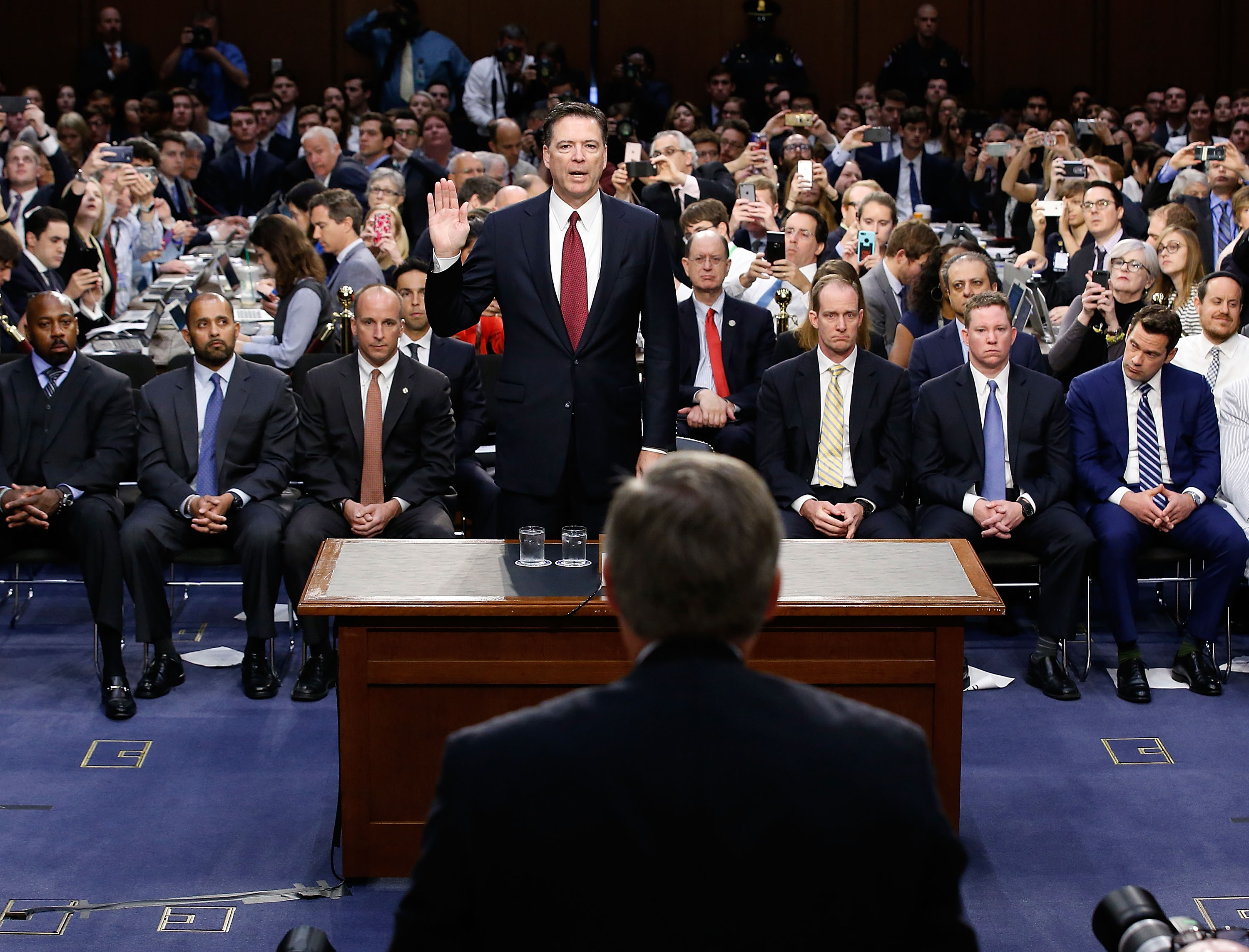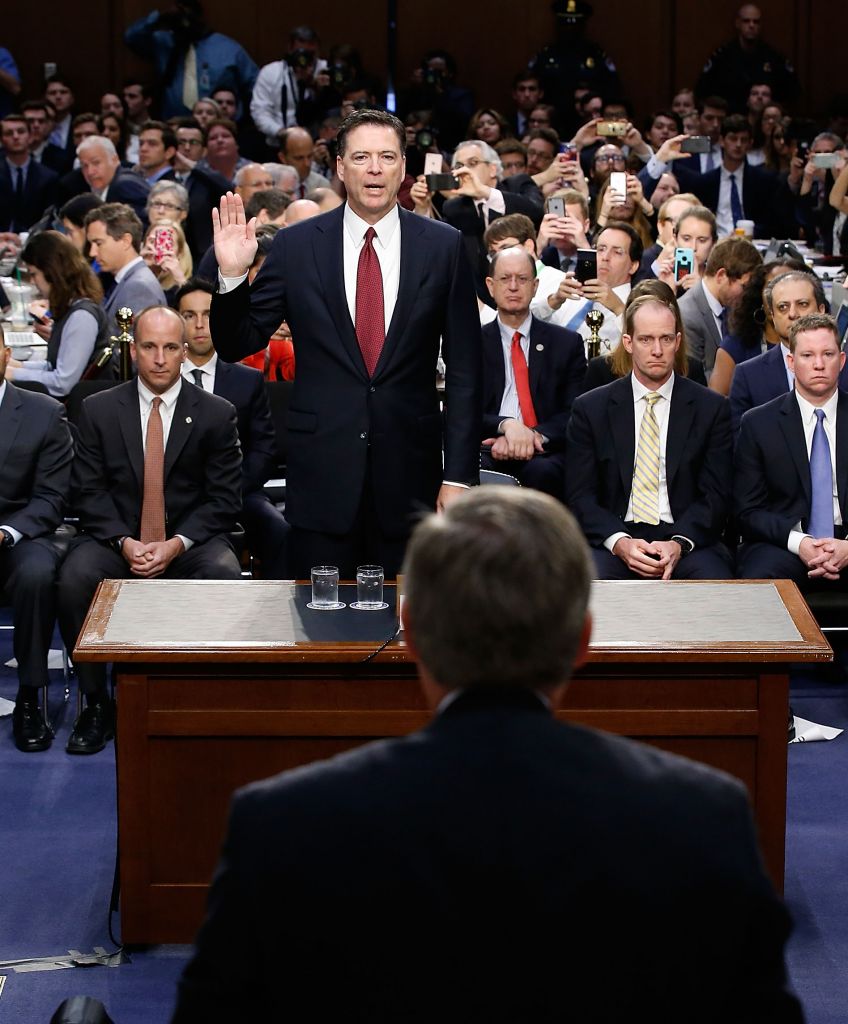 WASHINGTON, DC – JUNE 08: Former FBI Director James Comey is sworn in before testifing before the Senate Intelligence Committee in the Hart Senate Office Building on Capitol Hill June 8, 2017 in Washington, DC. Comey said that President Donald Trump pressured him to drop the FBI’s investigation into former National Security Advisor Michael Flynn and demanded Comey’s loyalty during the one-on-one meetings he had with president. (Photo by Alex Brandon – Pool/Getty Images)