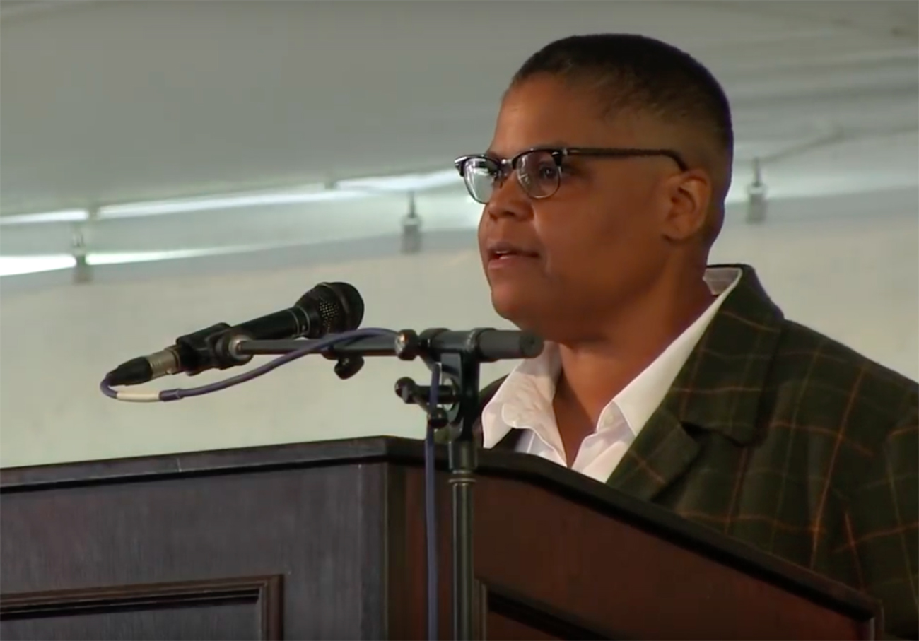 Keeanga-Yamahtta Taylor delivering the keynote commencement speech at Hampshire College’s commencement ceremony on May 20, 2017. (Screenshot from YouTube)