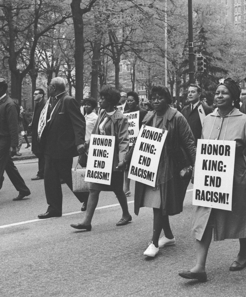 Marchers wear signs that read ‘Honor King: End Racism!’ and ‘Union Justice Now’ as they participate in the Sanitation Workers march, soon after the assassination of Dr. Martin Luther King, Jr., Memphis, TN, April 1968. (Photo by Robert Abbott Sengstacke/Getty Images)
