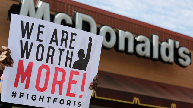 McDonald’s workers and supporters rally outside a McDonald’s, Wednesday, April 15, 2015, in Chicago. Fast-food workers calling for $15 an hour are picking up some more allies Wednesday. Airport workers, home care workers, Walmart workers and adjunct professors are among those set to join in the fight for $15 protests across the country, in what organizers are calling the biggest ever mobilization of workers in the U.S. (AP Photo/M. Spencer Green)