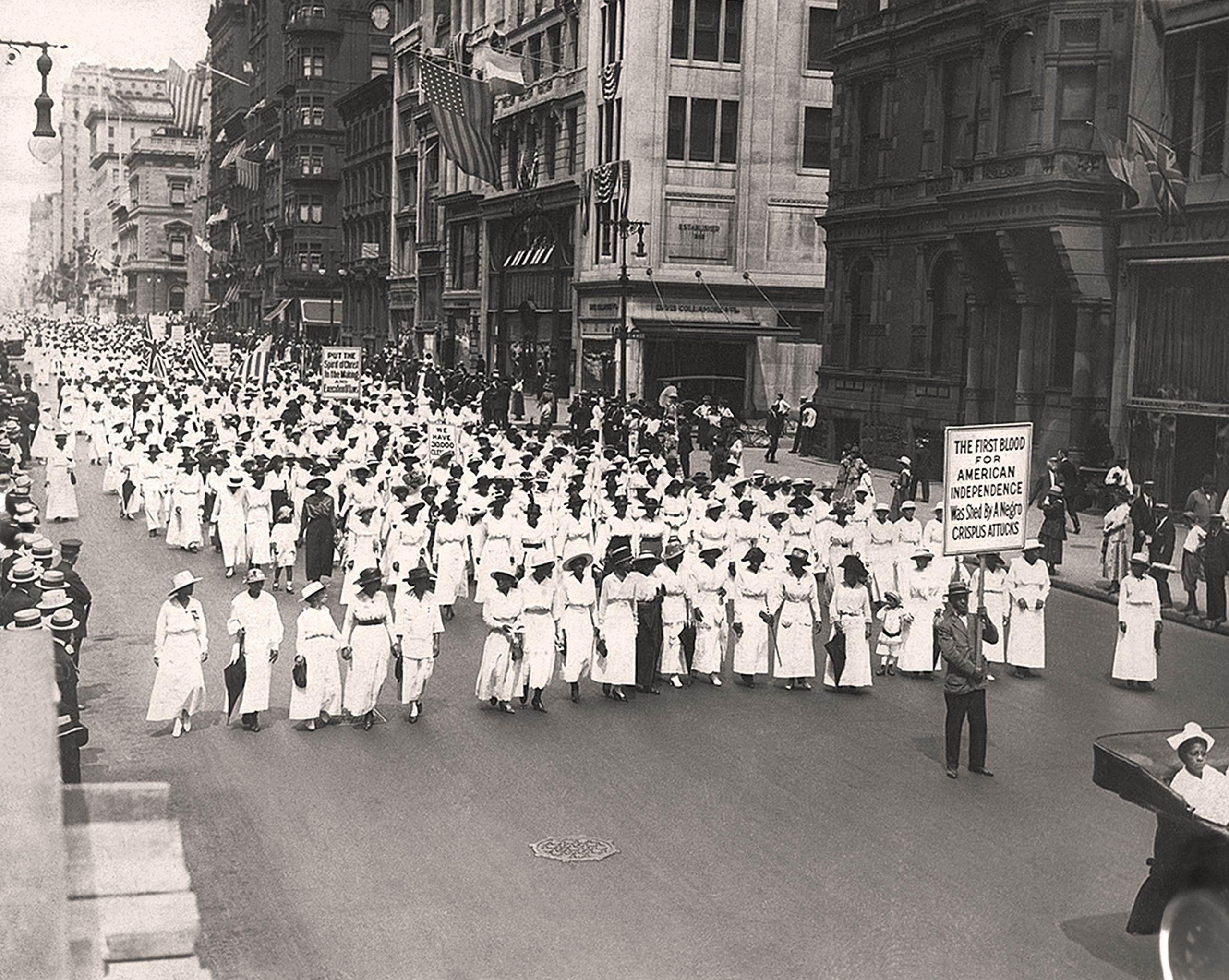 A silent march to protest the police treatment of blacks during riots in East St. Louis, New York, New York, 1917. They marched down Fifth Avenue on that summer Saturday without saying a word. They chanted no chants, sang no protest songs. The only sounds were the disconcertingly mournful thuds of muffled drums and, of course, the marchers’ footsteps on the hot pavement. It was a parade of silent protest. (Photo by Underwood Archives/Getty Images)