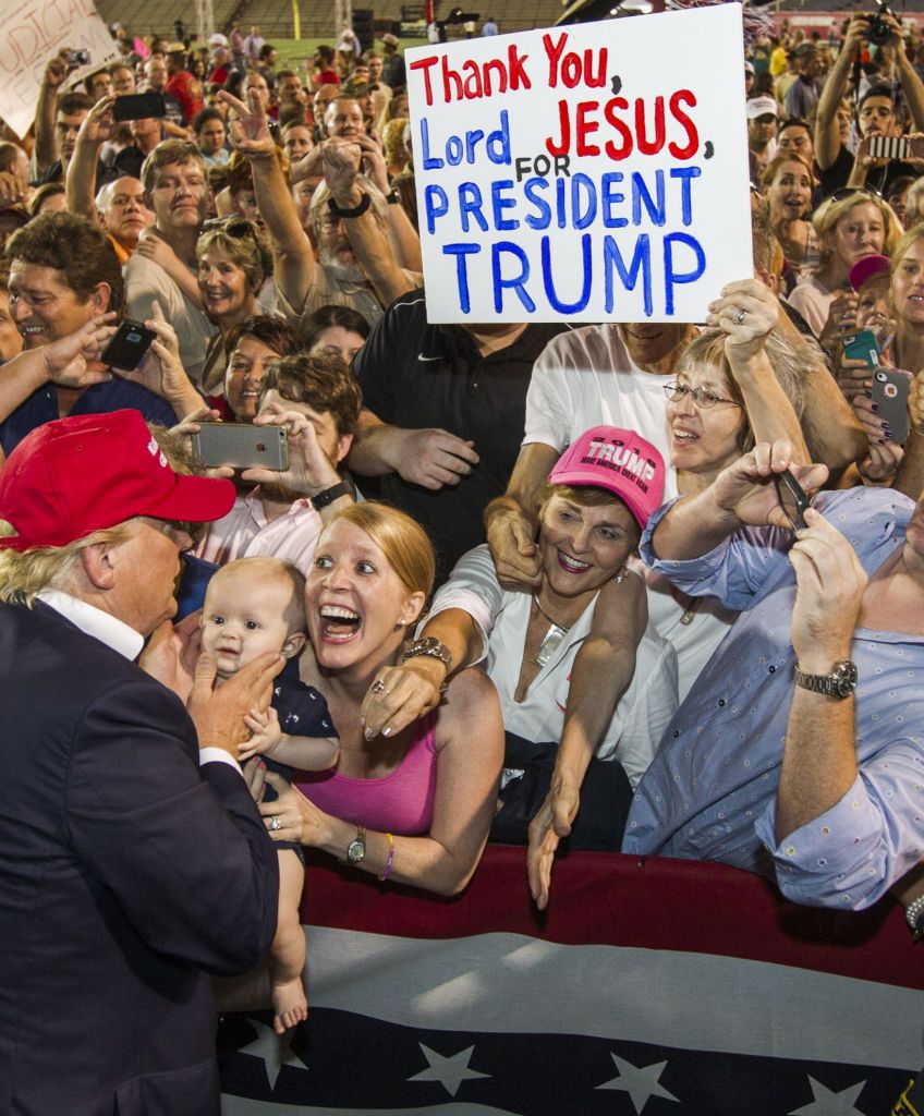 MOBILE, AL- AUGUST 21: Republican presidential candidate Donald Trump greets supporters after his rally at Ladd-Peebles Stadium on August 21, 2015 in Mobile, Alabama. The Trump campaign moved tonight’s rally to a larger stadium to accommodate demand. (Photo by Mark Wallheiser/Getty Images)