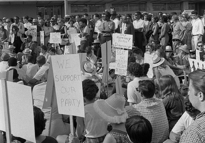 [African American and white Mississippi Freedom Democratic Party supporters demonstrating outside the 1964 Democratic National Convention, Atlantic City, New Jersey] / WKL.