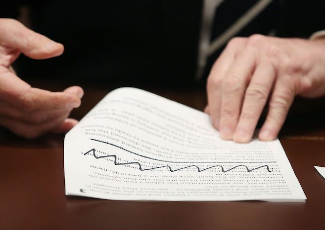 WASHINGTON, DC – JULY 17: U.S. President Donald Trump looks at his notes as he talks about his meeting with Russian President Vladimir Putin, during a meeting with House Republicans in the Cabinet Room of the White House on July 17, 2018 in Washington, DC. Following a diplomatic summit in Helsinki, Trump faced harsh criticism after a press conference with Putin where he would not say whether he believed Russia meddled with the 2016 presidential election. (Photo by Mark Wilson/Getty Images)
