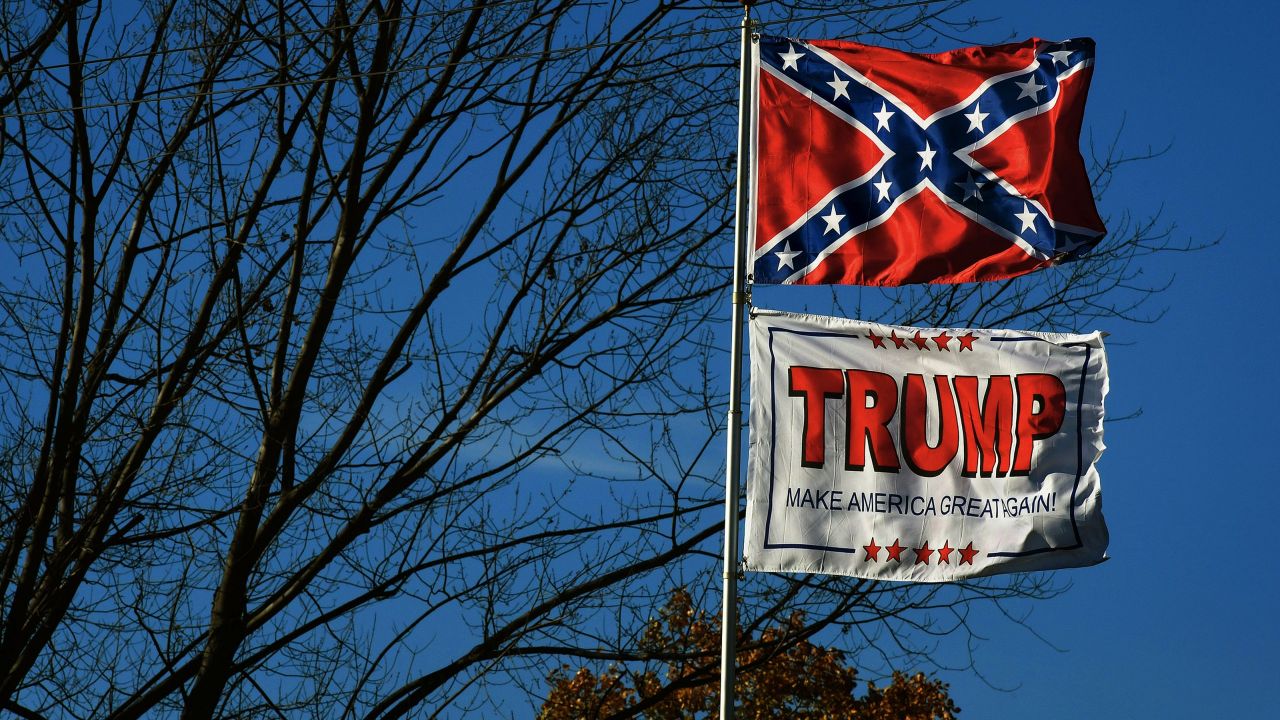 CHESTER, WV AUG 18: Some Confederate flag representations are being seen more often these days because of what has been labeled, “The Trump Effect.” Flying the flag in some places was once a political risk but in the Trump era more angry white Americans are using the flag motif as a protest vehicle and not concerned that it might represent painful imagery to some Americans. -These paired flags, The Confederate Flag and a Trump M.A.G.A. flag fly along the Lincoln Highway near a video store in Chester, West Virginia. -Many reject that the flag is a symbol of hate and claim that it’s a symbol of rebellion and a rebuke of political correctness. (Photo by Michael S. Williamson/The Washington Post via Getty Images)