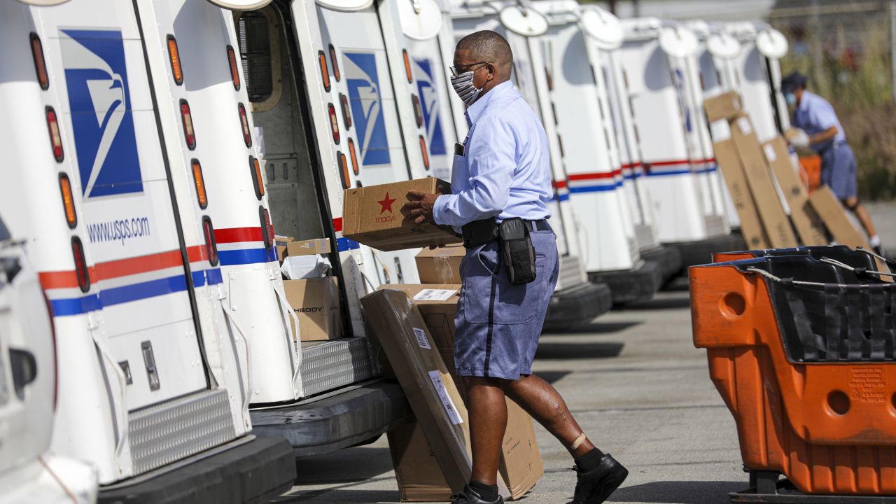 USPS Postal Workers-Postal crisis-Pandemic-Covid-19 Published July 18, 2020 at 1280 × 720 in Moyers & Company SAN CLEMENTE, CA – MAY 15: James Daniels, 59, a postal carrier, loads mail in his truck for delivery at San Clemente Post Office on Friday, May 15, 2020 in San Clemente, CA. (Irfan Khan / Los Angeles Times via Getty Images)
