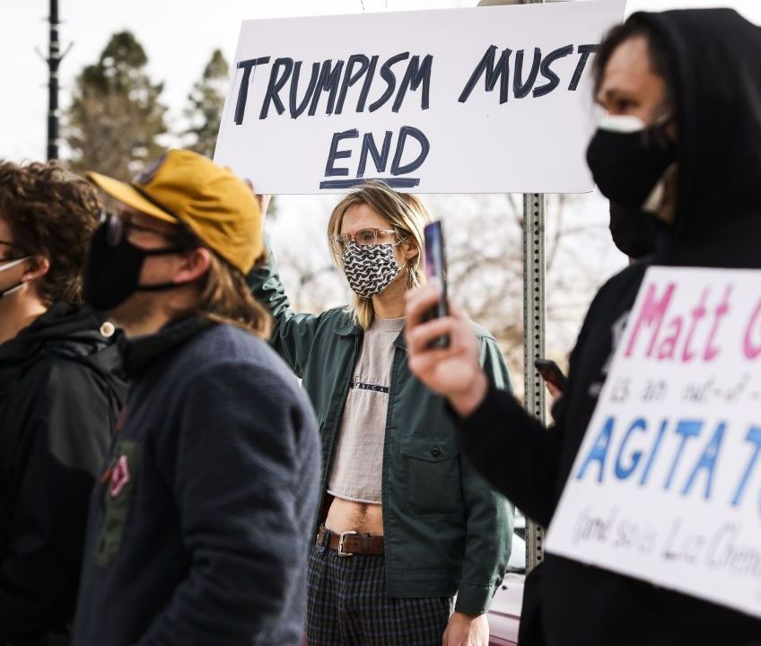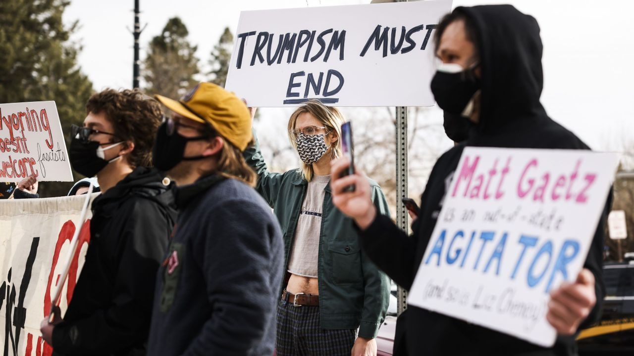 CHEYENNE, WY – JANUARY 28: Counter-demonstrators stand to the side as Rep. Matt Gaetz (R-FL) speaks to a crowd during a rally against Rep. Liz Cheney (R-WY) on January 28, 2021 in Cheyenne, Wyoming. Gaetz added his voice to a growing effort to vote Cheney out of office after she voted in favor of impeaching Donald Trump. (Photo by Michael Ciaglo/Getty Images)