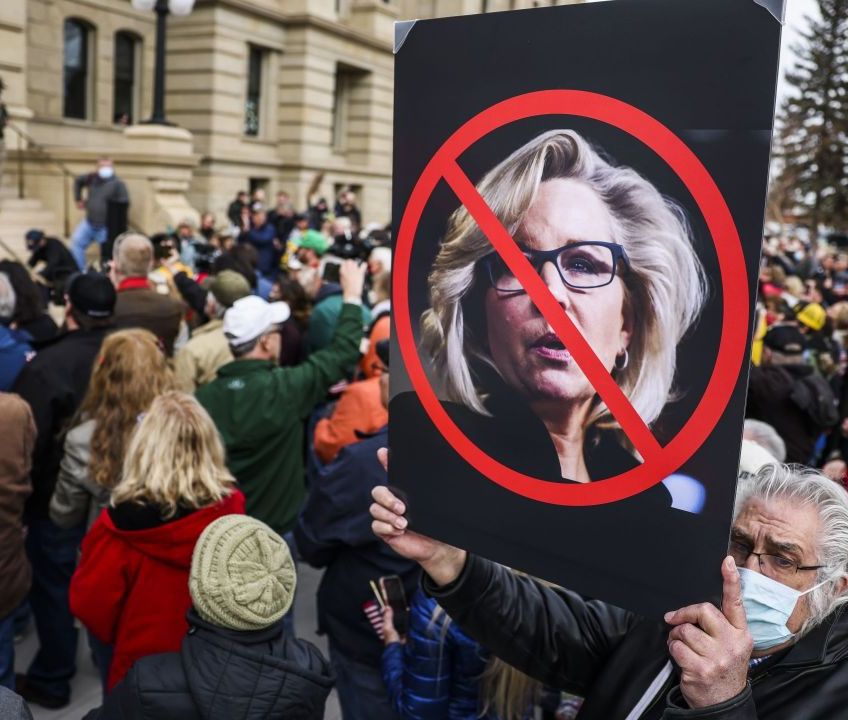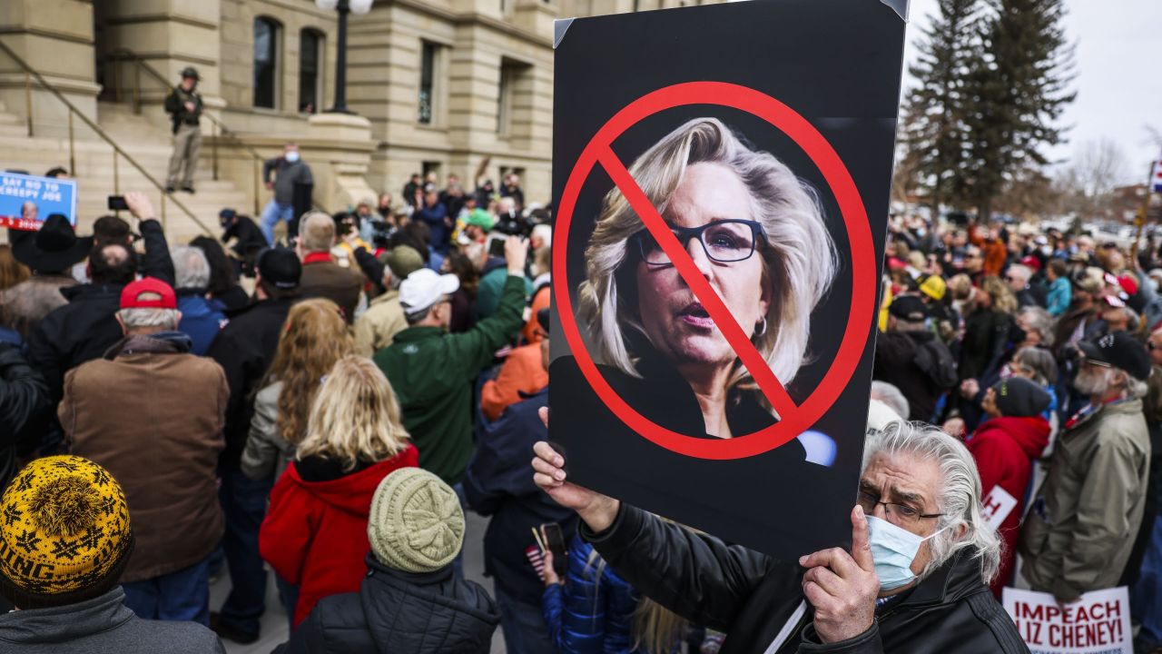 CHEYENNE, WY – JANUARY 28: A man holds up a sign against Rep. Liz Cheney (R-WY) as Rep. Matt Gaetz (R-FL) speaks to a crowd during a rally against her on January 28, 2021 in Cheyenne, Wyoming. Gaetz added his voice to a growing effort to vote Cheney out of office after she voted in favor of impeaching Donald Trump. (Photo by Michael Ciaglo/Getty Images)