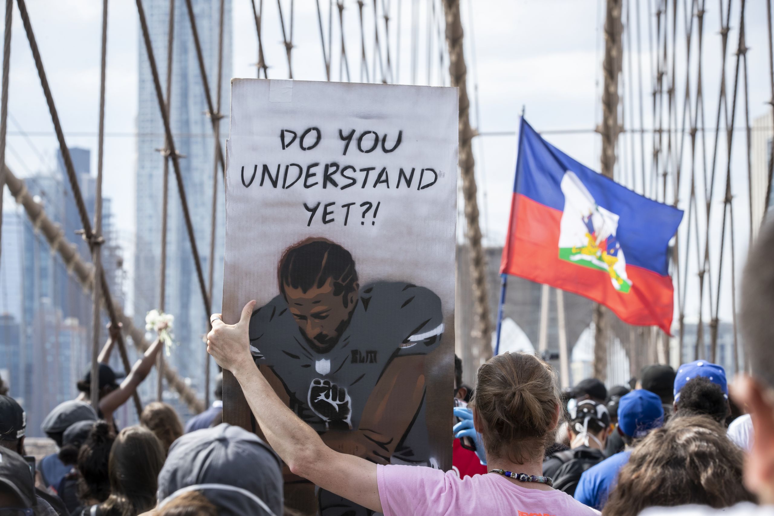 MANHATTAN, NY – JUNE 04: A Caucasian protester holds a sign that says,”Do You Understand Yet?” with a picture of Colin Kaepernick, former quarterback for the San Francisco 49ers, taking a knee with a Black Power Fist on in the middle of his jersey with the Arches of the Brooklyn Bridge behind them as they walk across the Brooklyn Bridge in protest of police racism. Protesters walked from Brooklyn to Manhattan after a memorial ceremony in Brooklyn with Terrence Floyd, brother of George Floyd. Protesters have taken to the streets across America and around the world after the killing of George Floyd at the hands of a white police officer Derek Chauvin that was kneeling on his neck during his arrest as he pleaded that he couldn’t breathe. The protest are attempting to give a voice to the need for human rights for African American’s and to stop police brutality against people of color. Many people were wearing masks and observing social distancing due to the coronavirus pandemic. Terrence Floyd echoed the word of peaceful protest saying that violent protests are overshadowing What’s Going On. New York City remains in a curfew as an answer to nights of unrest looting and destruction. Photographed in the Manhattan Borough of New York on June 04, 2020, USA. (Photo by Ira L. Black/Corbis via Getty Images)