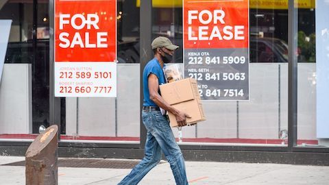 NEW YORK, NEW YORK – AUGUST 25: A person wearing a protective mask walks by signs displayed outside a retail space for sale in Harlem as the city continues Phase 4 of re-opening following restrictions imposed to slow the spread of coronavirus on August 25, 2020 in New York City. The fourth phase allows outdoor arts and entertainment, sporting events without fans and media production. (Photo by Noam Galai/Getty Images)