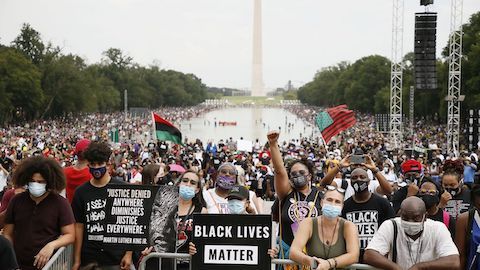 WASHINGTON, DC – AUGUST 28: Attendees participate in the 2020 March on Washington, officially known as the “Commitment March: Get Your Knee Off Our Necks,” at the Lincoln Memorial on August 28, 2020 in Washington, DC. The march coincides with the 57th anniversary of Martin Luther King Jr.’s March on Washington, where he delivered his historic “I Have A Dream” speech in 1963. (Photo by Paul Morigi/Getty Images)
