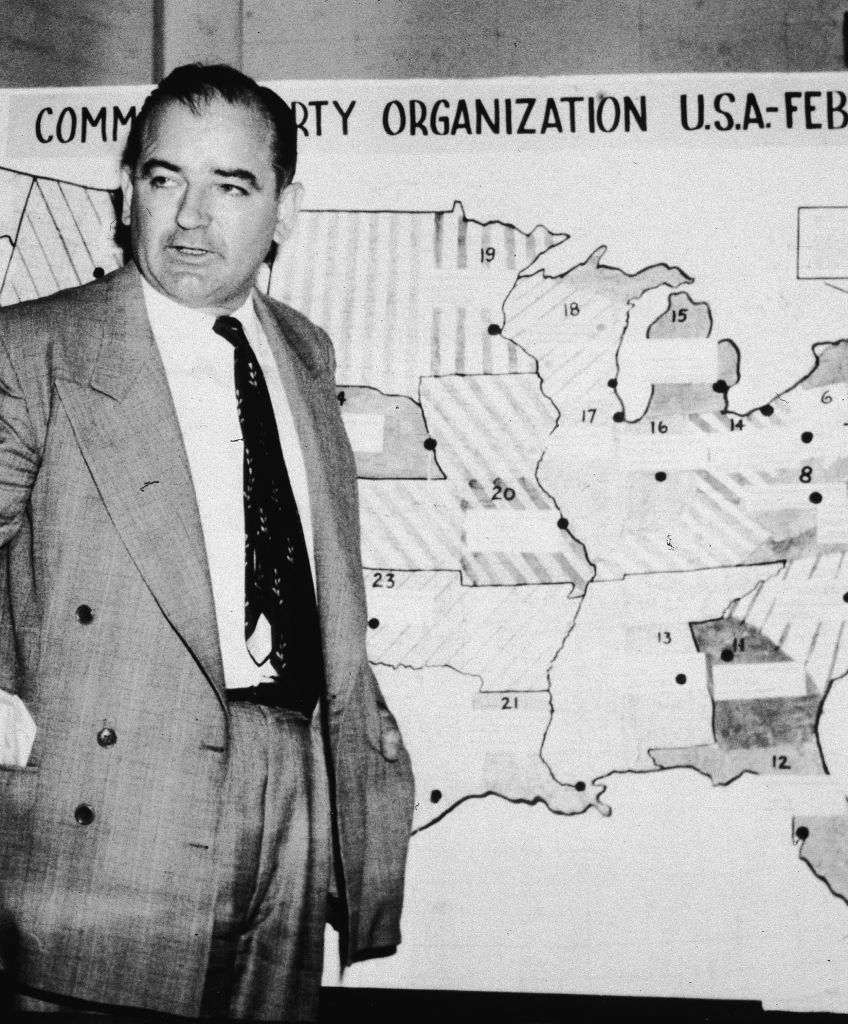 American politician Joseph McCarthy (1908 ? 1957), Republican senator from Wisconsin, testifies against the US Army during the Army-McCarthy hearings, Washington, DC, June 9, 1954. McCarthy stands before a map which charts Communist activity in the United States. (Photo by Getty Images)