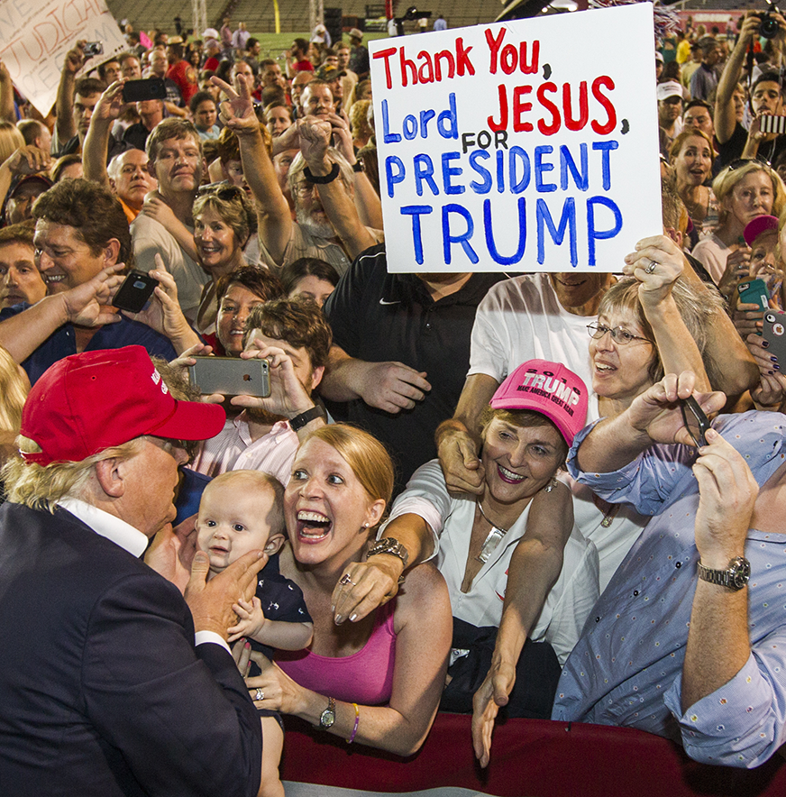 MOBILE, AL- AUGUST 21: Republican presidential candidate Donald Trump greets supporters after his rally at Ladd-Peebles Stadium on August 21, 2015 in Mobile, Alabama. The Trump campaign moved tonight’s rally to a larger stadium to accommodate demand. (Photo by Mark Wallheiser/Getty Images)