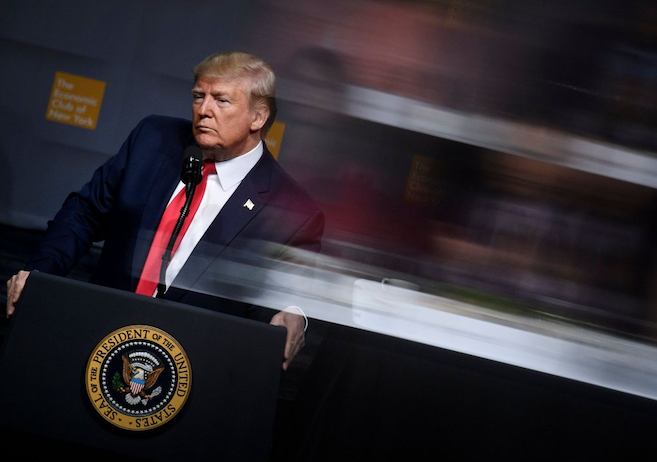 US President Donald Trump pauses while speaking at the Economic Club of New York at the New York Hilton Midtown November 12, 2019, in New York, New York. – European stock markets closed higher on Tuesday, helped by speculation that US President Donald Trump will postpone a tariffs decision on European-made cars. (Photo by Brendan Smialowski / AFP) (Photo by BRENDAN SMIALOWSKI/AFP via Getty Images)