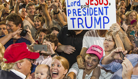 MOBILE, AL- AUGUST 21: Republican presidential candidate Donald Trump greets supporters after his rally at Ladd-Peebles Stadium on August 21, 2015 in Mobile, Alabama. The Trump campaign moved tonight’s rally to a larger stadium to accommodate demand. (Photo by Mark Wallheiser/Getty Images)