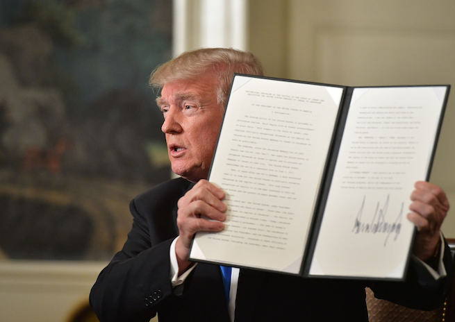 US President Donald Trump holds up a signed proclamation after he delivered a statement on Jerusalem from the Diplomatic Reception Room of the White House in Washington, DC on December 6, 2017. President Donald Trump on Wednesday recognized the disputed city of Jerusalem as Israel’s capital — a historic decision that overturns decades of US policy and risks triggering a fresh spasm of violence in the Middle East.”I have determined that it is time to officially recognize Jerusalem as the capital of Israel,” Trump said from the White House.”It’s the right thing to do.” / AFP PHOTO / MANDEL NGAN (Photo credit should read MANDEL NGAN/AFP via Getty Images)
