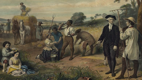George Washington as a farmer, standing among enslaved African-American field workers harvesting grain, with Mt. Vernon in background. The image, created in 1850s, during the contentious decade prior to the Civil War, was likely espousing the pro-slavery position by depicted a founding father as a benign slave holder