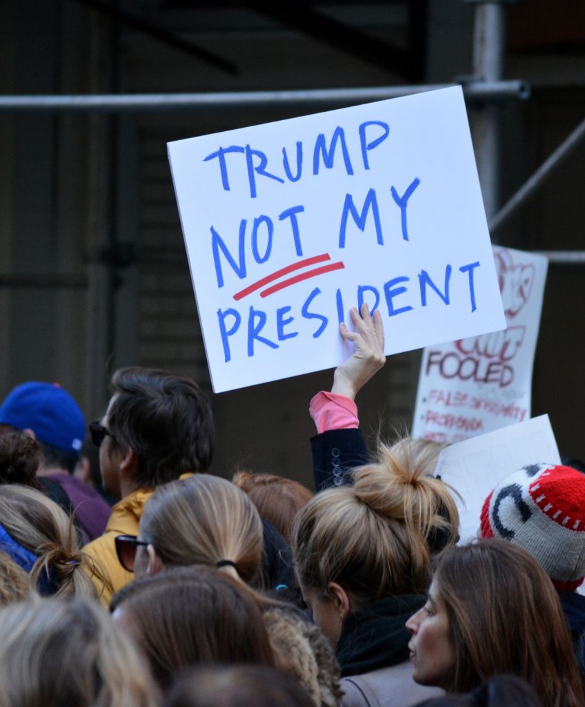 New York, New York – November 12, 2016: Protester carrying a sign while marching in a “Trump is not my President” rally in response to the 2016 Presidential Election of Donald Trump in New York City in 2016.
