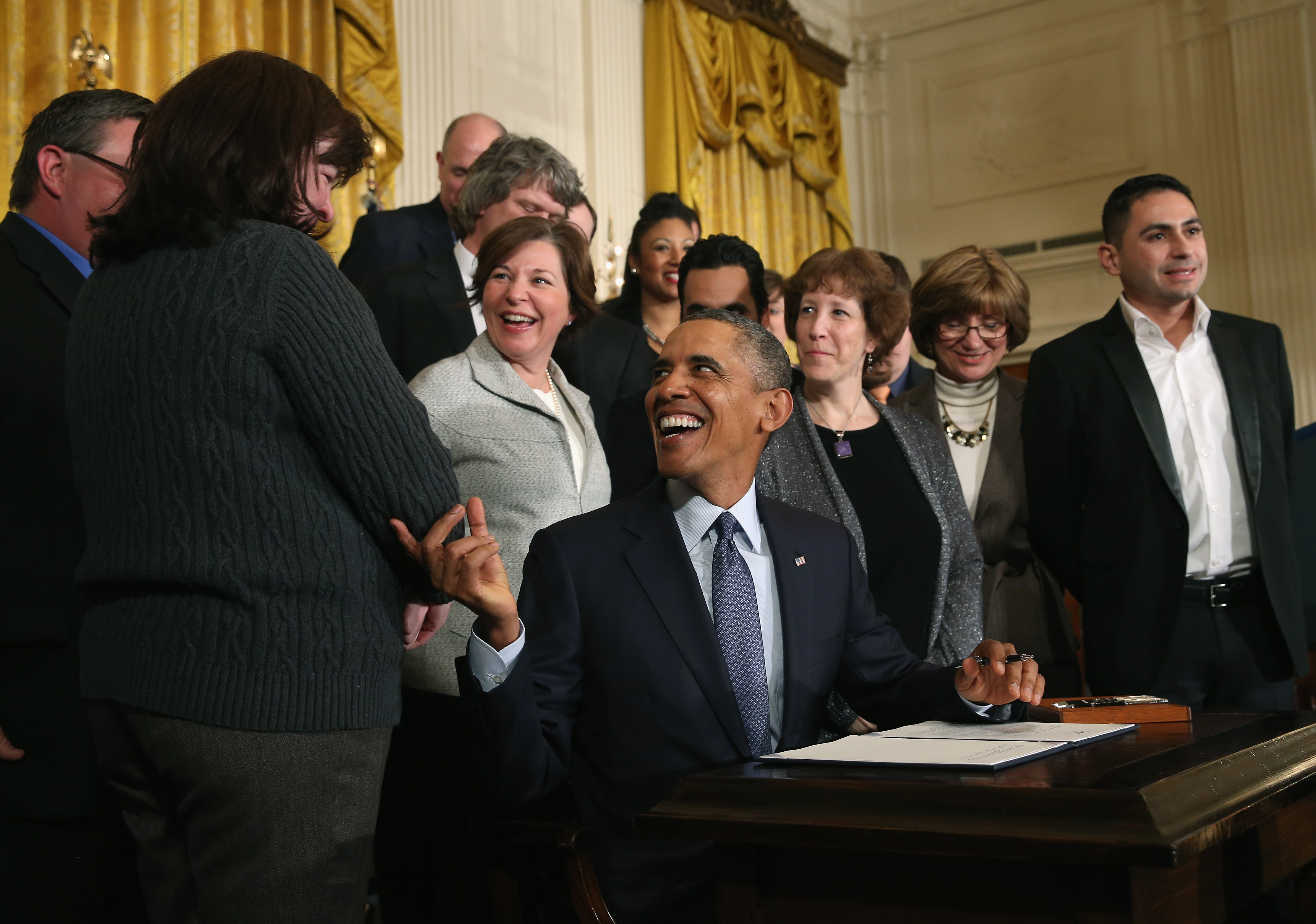WASHINGTON, DC – MARCH 13: U.S. President Barack Obama jokes with guests before signing a presidential memorandum for modernizing overtime protections for workers during an event in the East Room of the White House, on March 13, 2014 in Washington, DC. The memorandum will direct the Secretary of Labor to begin the process of addressing overtime pay protections to make sure millions of workers are paid a fairly. (Photo by Mark Wilson/Getty Images)