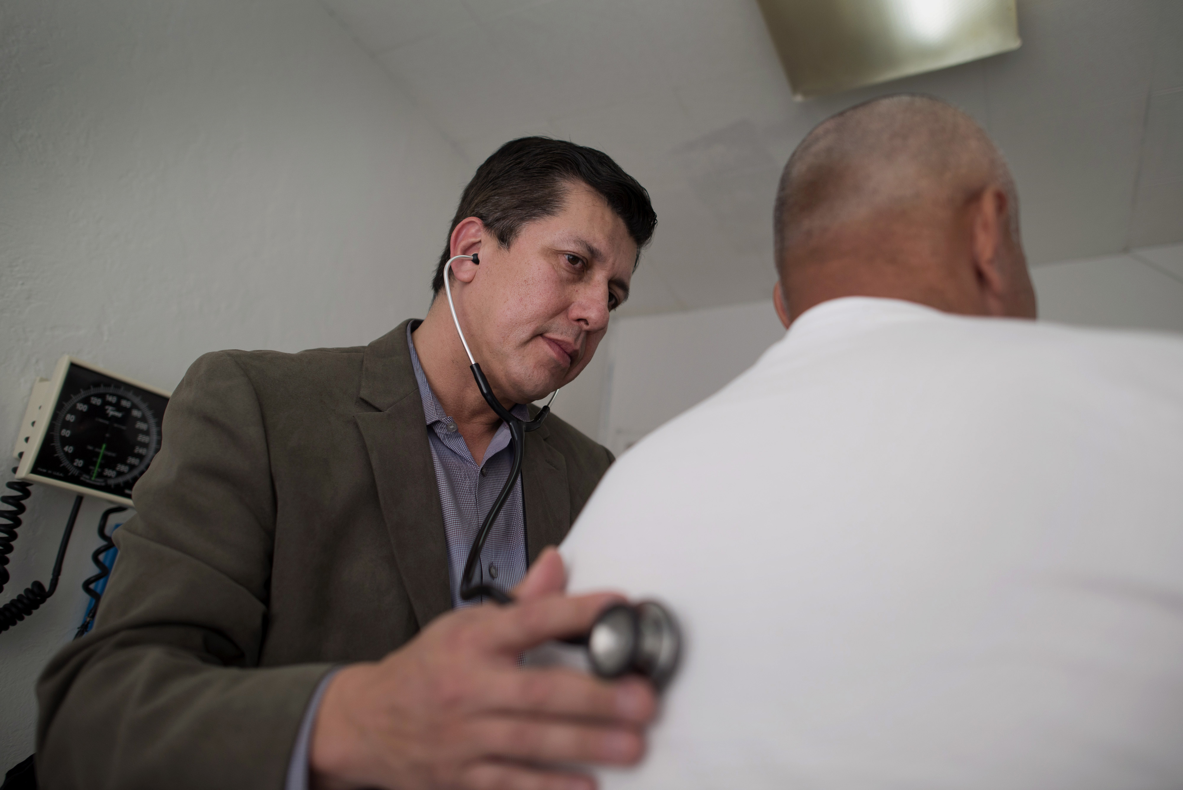Dr. Esteban Lovato performs a routine check-up on a patient at the La Loma Medical Center in Oakland, California, U.S., on Friday, Jan. 31, 2014. Enrollment has lagged among Latinos in California, a key demographic thats critical to the success of the 2010 Patient Protection and Affordable Care Act and in the most populous U.S. state that was among the first to embrace the government-run program aimed at offering health care to uninsured Americans. Photographer: David Paul Morris/Bloomberg via Getty Images
