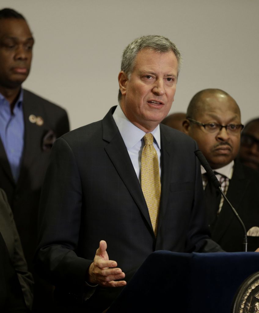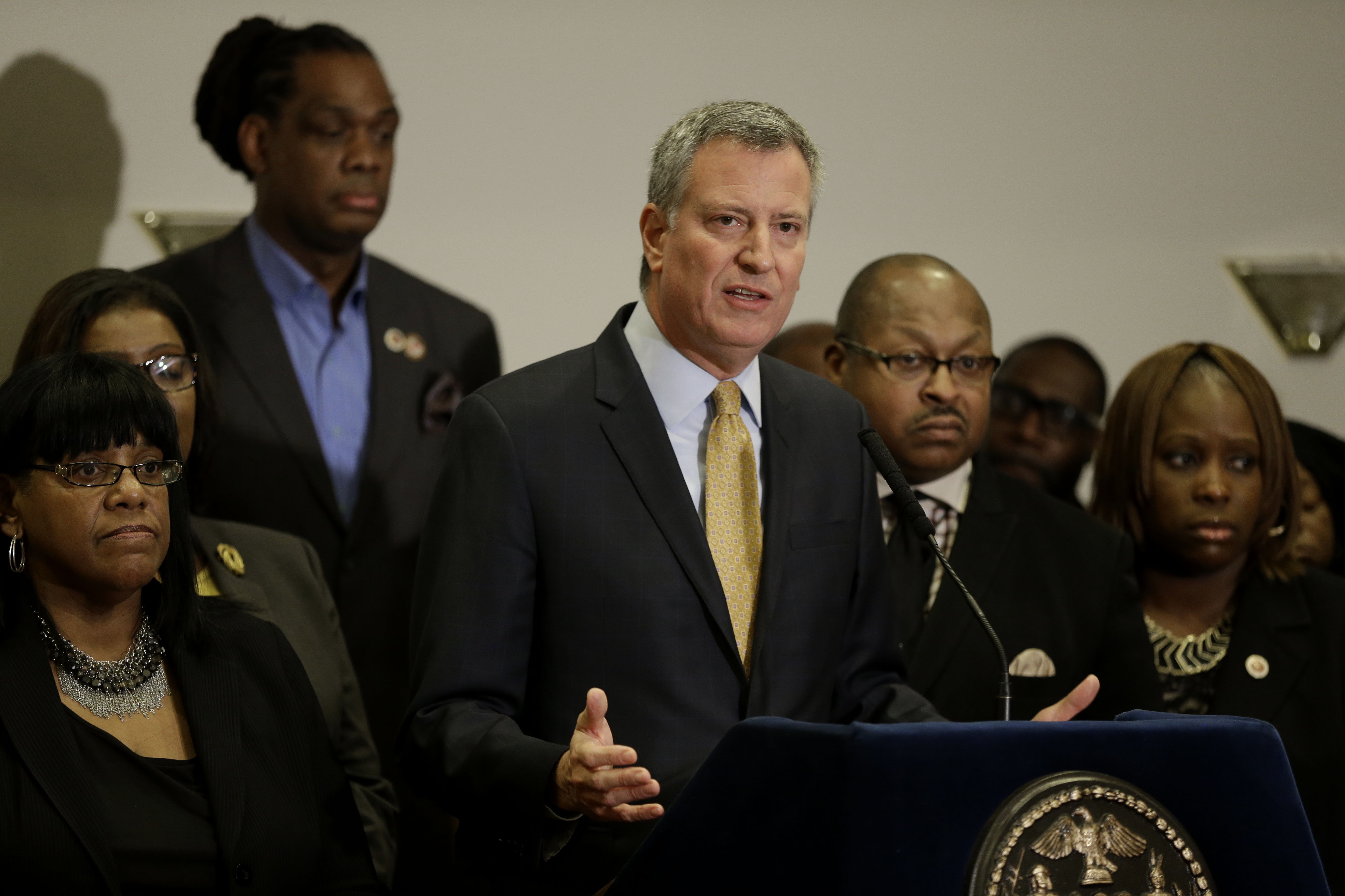 New York City Mayor Bill de Blasio, surrounded by community leaders, speaks to reporters about the grand jury’s decision in the Eric Garner case in the borough of Staten Island in New York, Wednesday, Dec. 3, 2014. A grand jury cleared the white New York City police officer Wednesday in the videotaped chokehold death of Garner, an unarmed black man, who had been stopped on suspicion of selling loose, untaxed cigarettes, a lawyer for the victim’s family said. A video shot by an onlooker and widely viewed on the Internet showed the 43-year-old Garner telling a group of police officers to leave him alone as they tried to arrest him. The city medical examiner ruled Garner’s death a homicide and found that a chokehold contributed to it. (AP Photo/Seth Wenig)