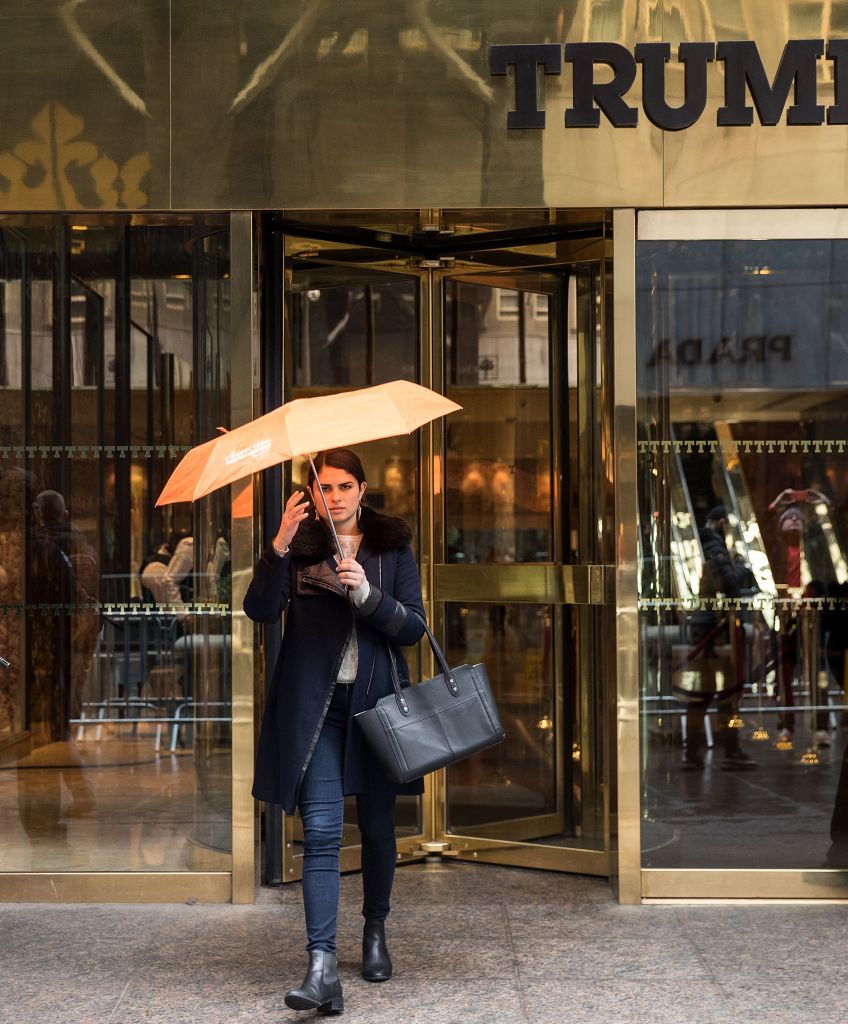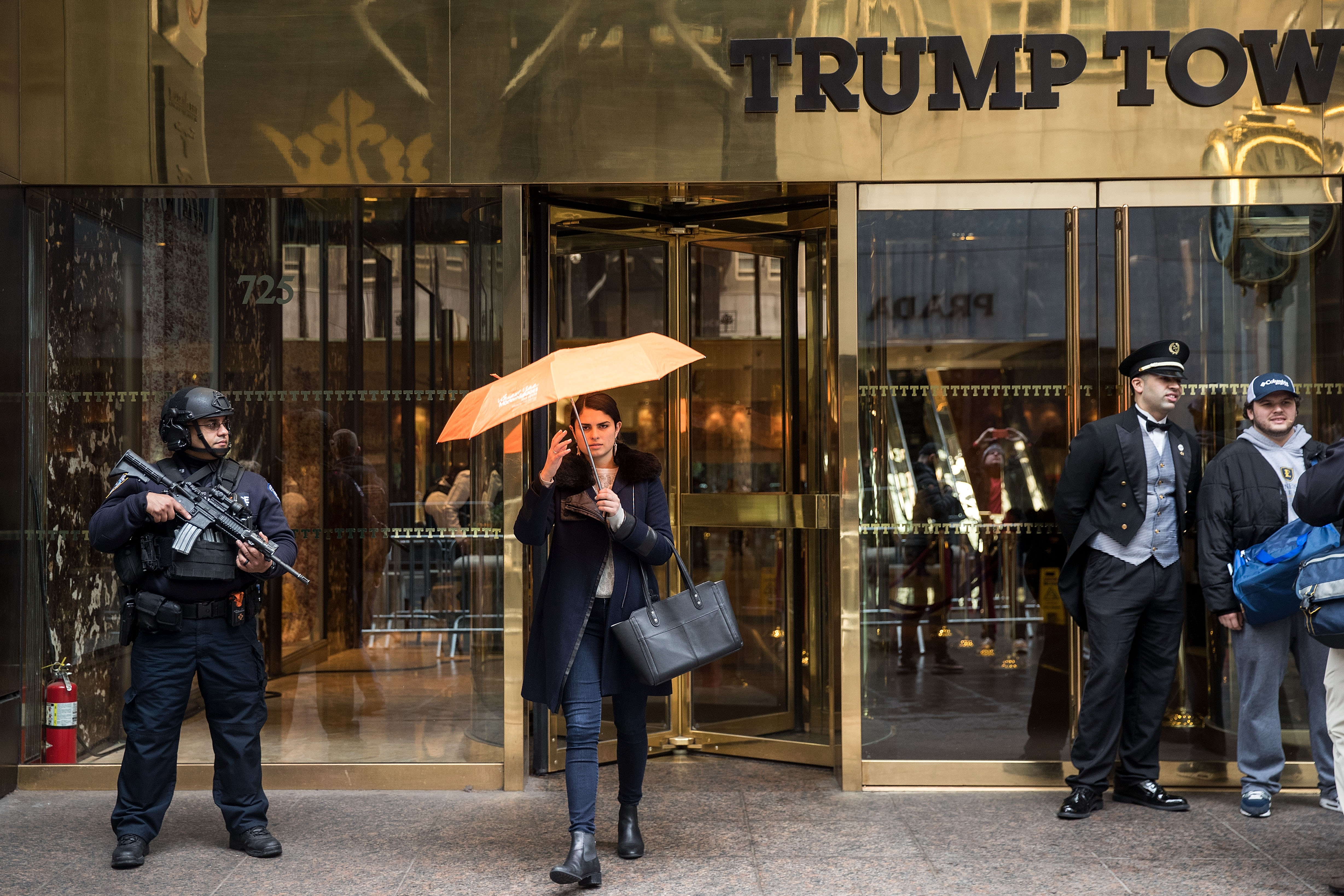 NEW YORK, NY – MARCH 7: (L to R) A New York City police officer looks on as a woman exits Trump Tower, March 7, 2017 in New York City. In a series of tweets on Saturday morning, President Donald Trump accused former President Barack Obama of ordering wiretapping at Trump Tower during the run up to the election. (Photo by Drew Angerer/Getty Images)