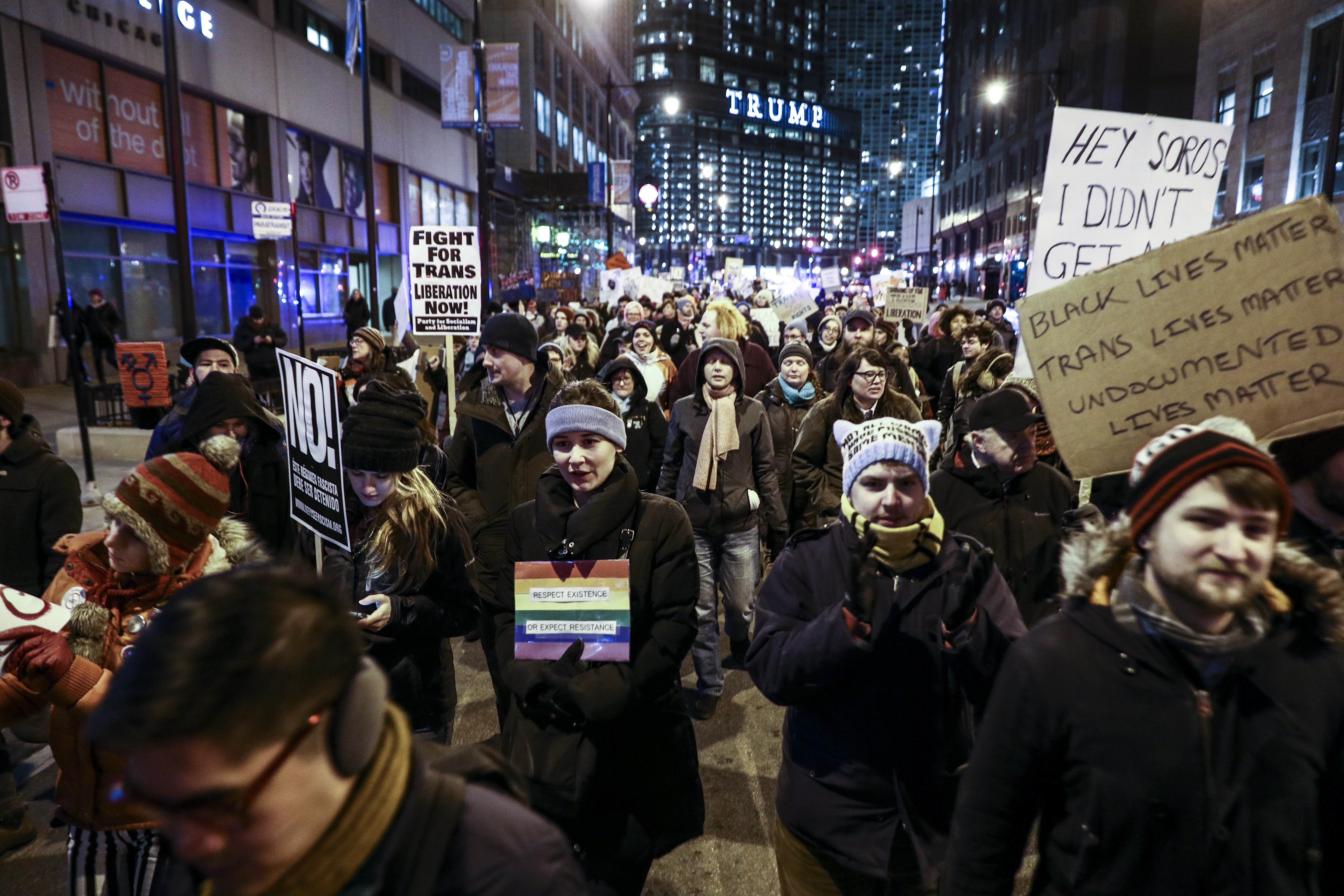 Thousands of people gather outside the Trump tower to rally in defense of transgender rights in Chicago on March 3, 2017. (Photo by Bilgin S. Sasmaz/Anadolu Agency/Getty Images)