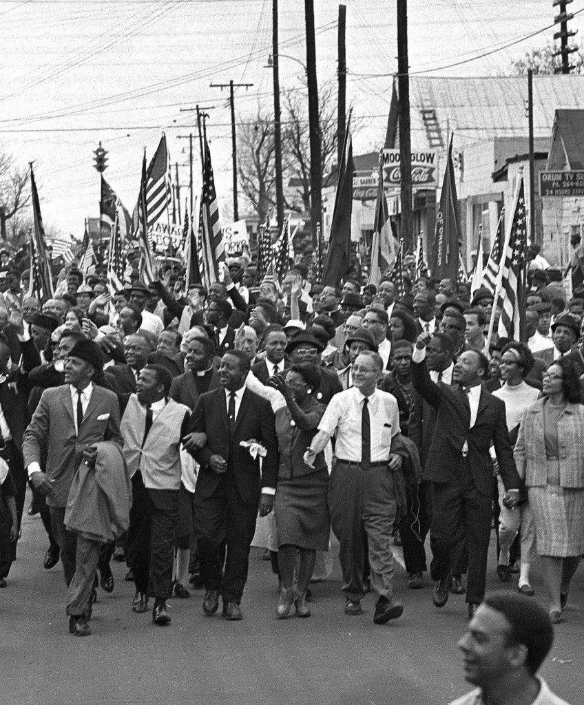 FILE – In this March 21, 1965 file photo, Dr. Martin Luther King, foreground row, fifth from right, waves as marchers stream across the Alabama River on the first of a five day, 50-mile march to the state capitol at Montgomery, Ala. (AP Photo/File)