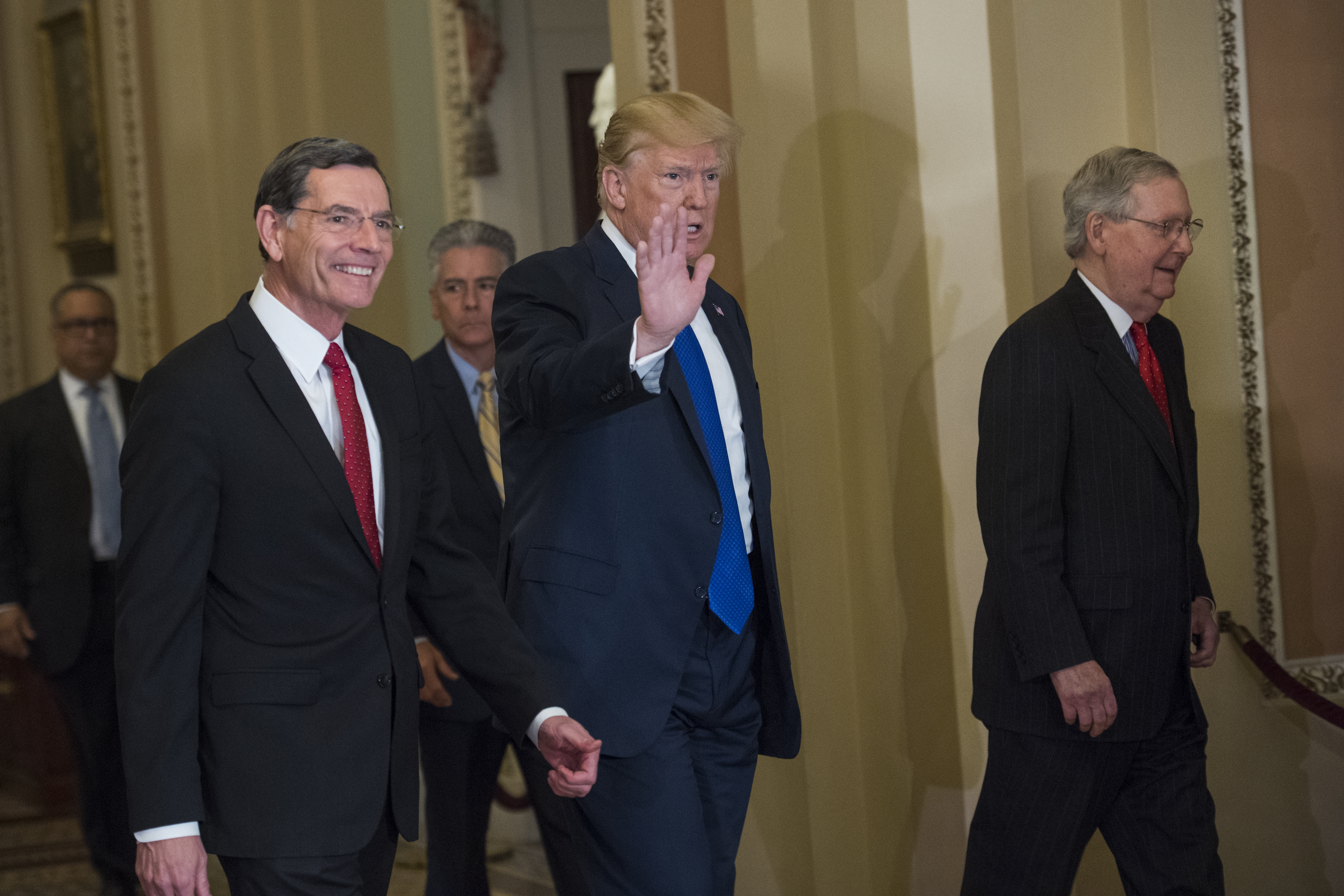 President Donald Trump arrives with Sen. John Barrasso (R-WY) and Senate Majority Leader Mitch McConnell (R-KY) for the Republican Senate Policy luncheon in the Capitol to discuss the tax reform bill on Nov. 28, 2017. (Photo By Tom Williams/CQ Roll Call)