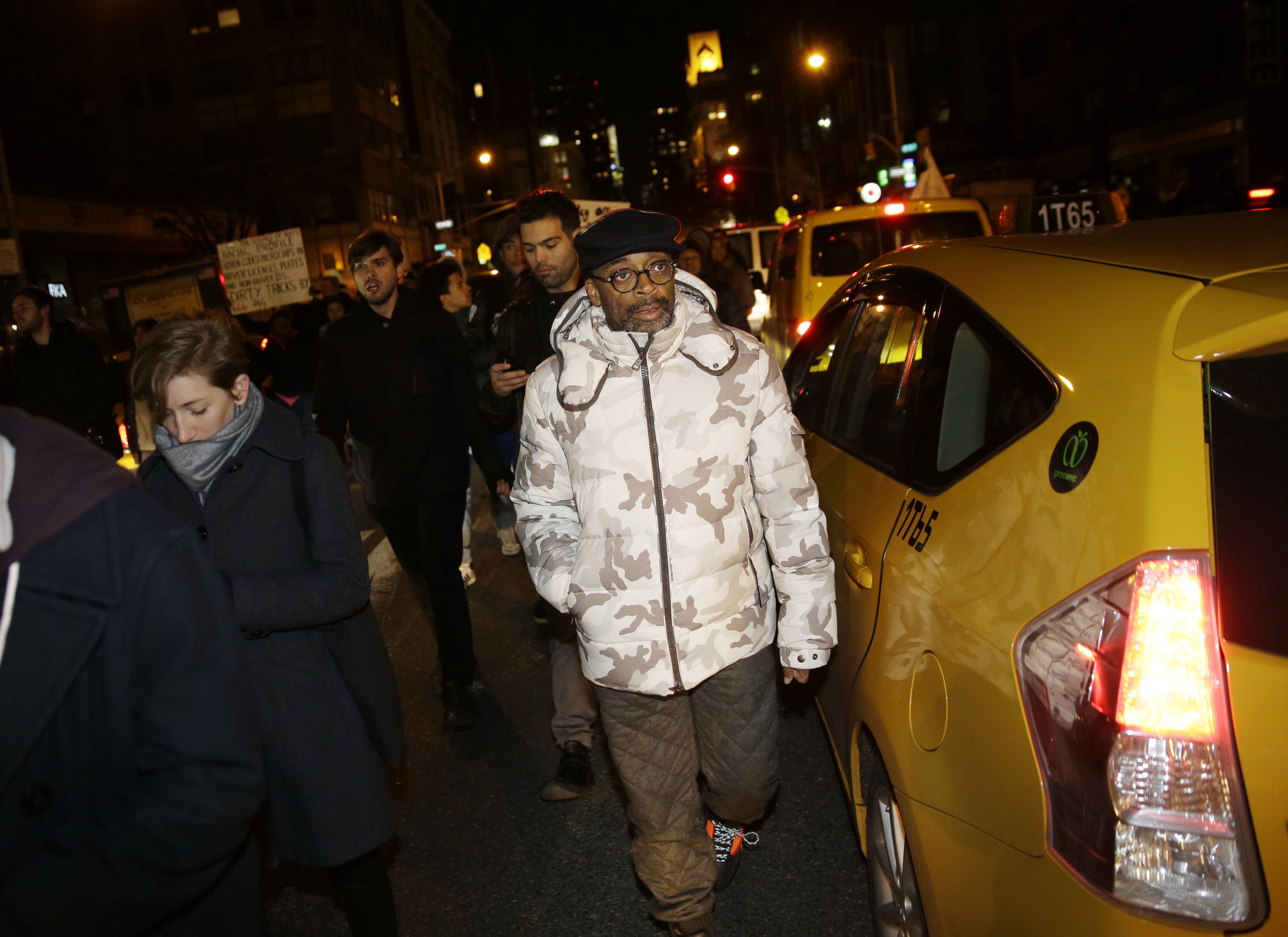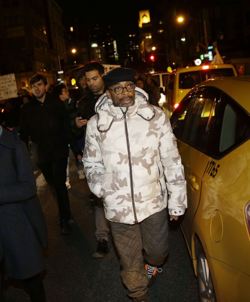 Director Spike Lee marches with protesters through the streets in response to the grand jury’s decision in the Eric Garner case in Times Square in New York, Wednesday, Dec. 3, 2014. The grand jury cleared a white New York City police officer Wednesday in the videotaped chokehold death of Garner, an unarmed black man, who had been stopped on suspicion of selling loose, untaxed cigarettes, a lawyer for the victim’s family said. (AP Photo/Seth Wenig)