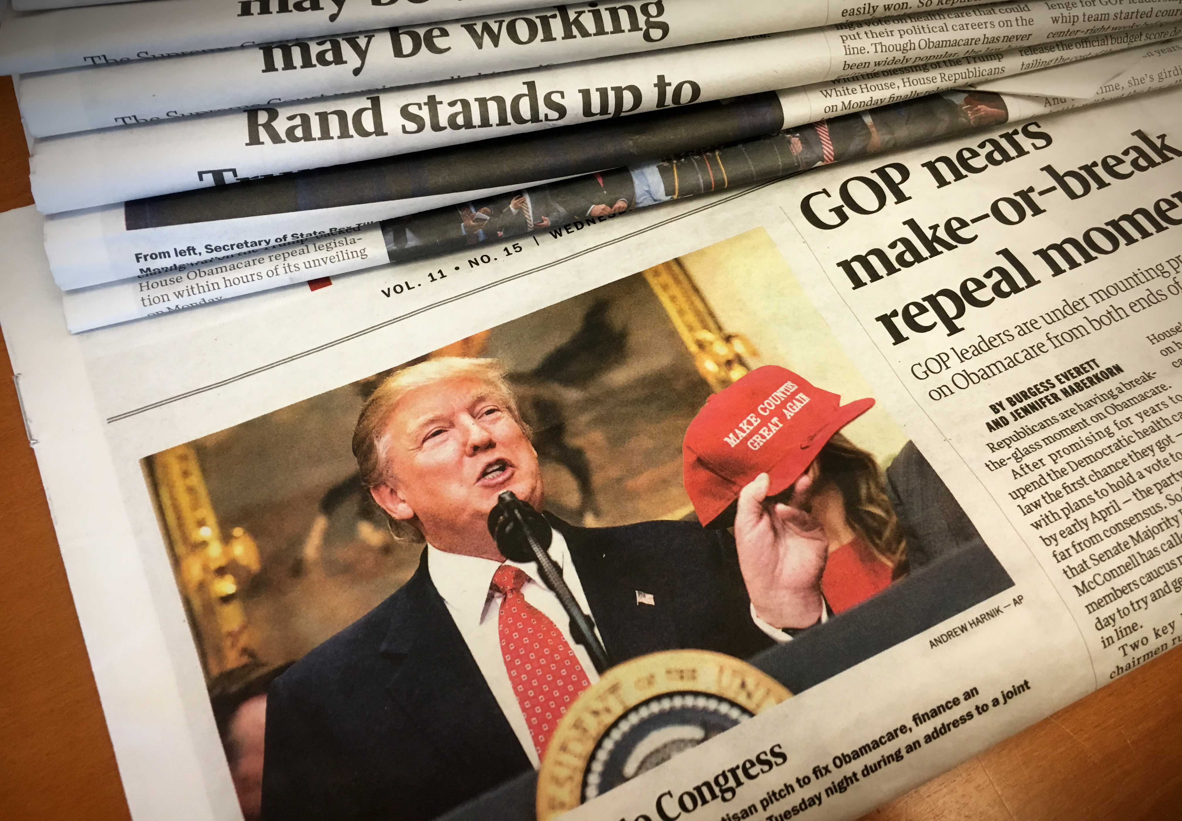 trump-newspaper Published March 9, 2017 at 4032 × 2803 in trump-newspaper Donald Trump making headlines. (Photo by John Light) Donald Trump making headlines. (Photo by John Light)
