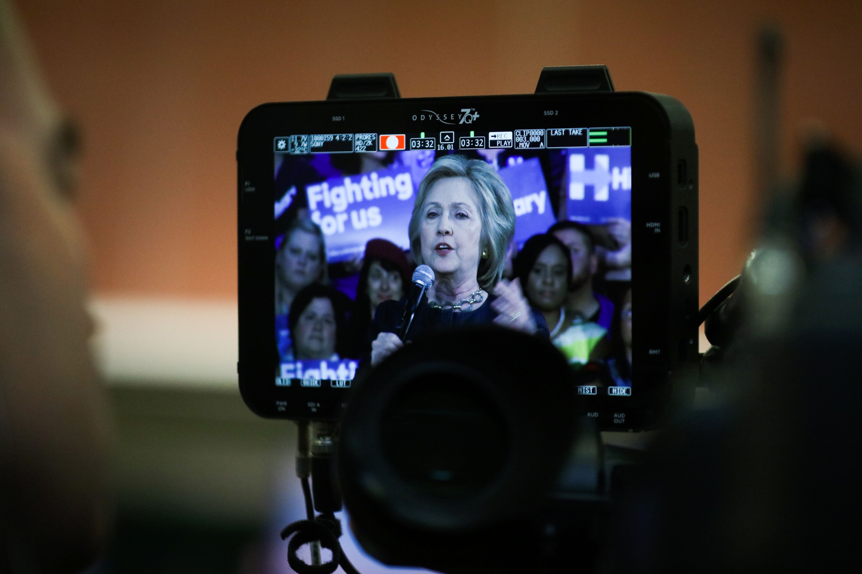 A cameraman watches as Democratic presidential candidate Hillary Clinton speaks to supporters during a rally in Oakland, California, on May 6, 2016. (GABRIELLE LURIE/AFP/Getty Images)