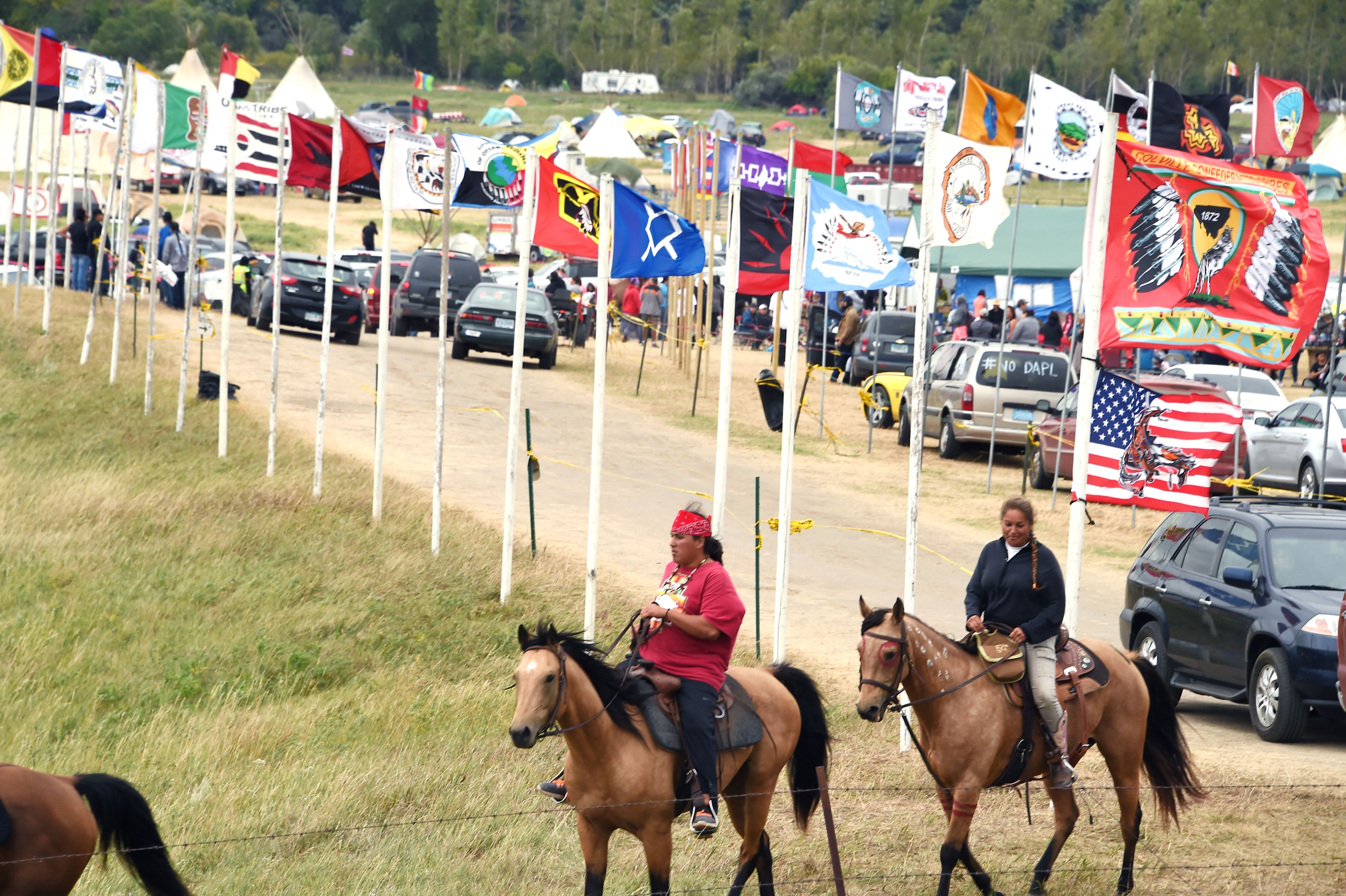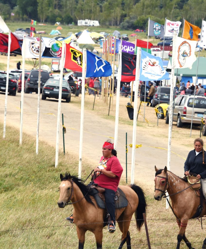 Flags of Native American tribes from across the US and Canada line the entrance to a protest encampment near Cannon Ball, North Dakota where members of the Standing Rock Sioux Tribe and their supporters have gather to voice their opposition to the Dakota Access Pipeline (DAPL), September 3, 2016.